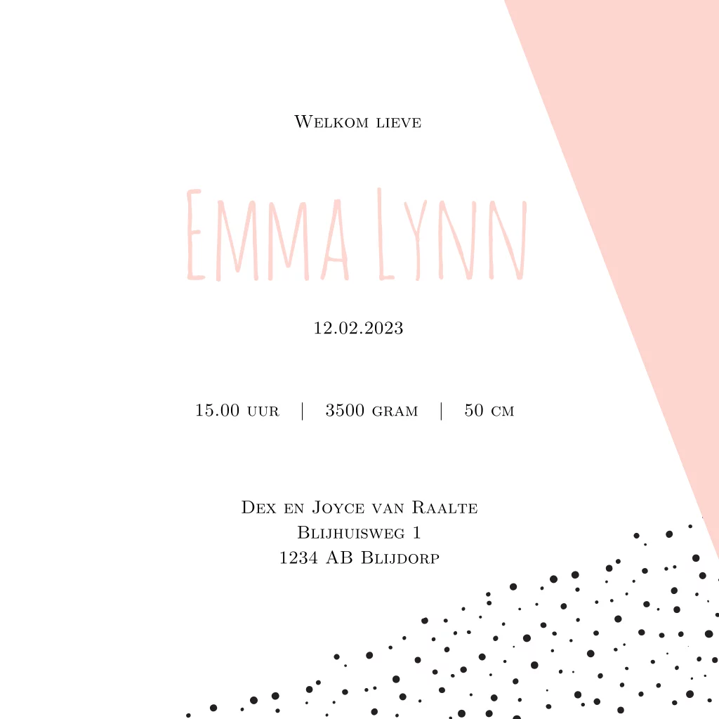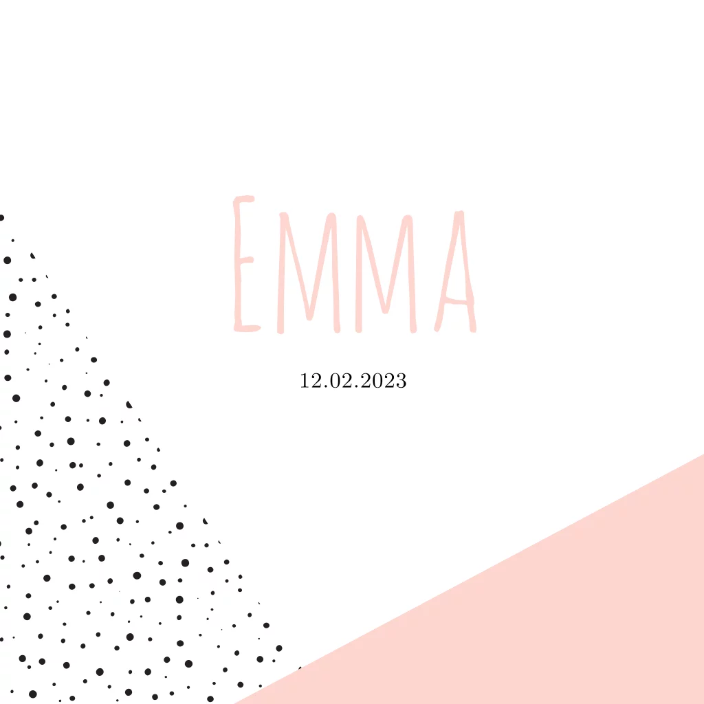 Geboortekaartje voor een meisje met geometrische vlakken. Dit kaartje met de babynaam Emma is overwegend wit en heeft een schuin vlak in de kleur pastel roze en een schuin vlak met een stipjes patroon. De teksten en lettertypes, evenals de kleuren zijn aan te passen in de editor.