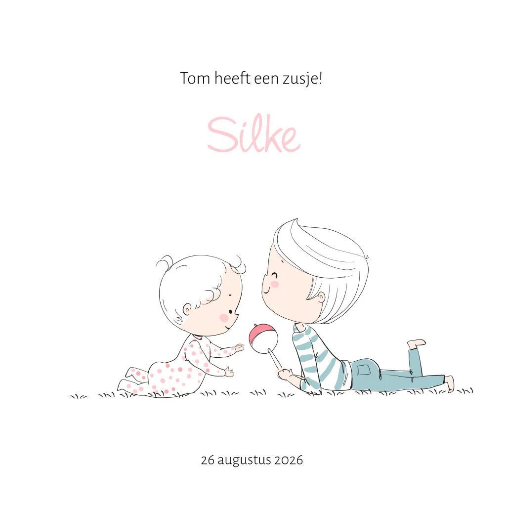 Een lief getekend geboortekaartje met een illustratie van twee kindjes. Dit geboortekaartje voor een tweede kindje, een jongen en een baby meisje, is super schattig omdat de twee kindjes met elkaar spelen. Dit babykaartje Silke is eenvoudig zelf aan te passen.