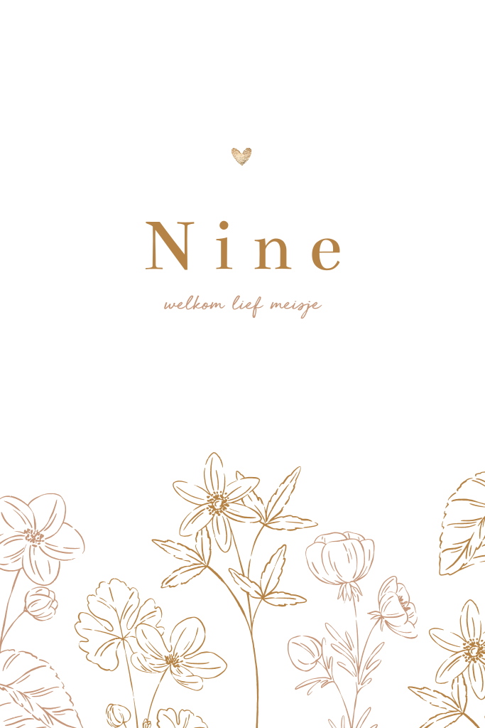 De babynaam Nine staat in een strak lettertype met boven de naam een klein gouden hartje. Pas dit kaartje naar je eigen smaak aan in de editor.