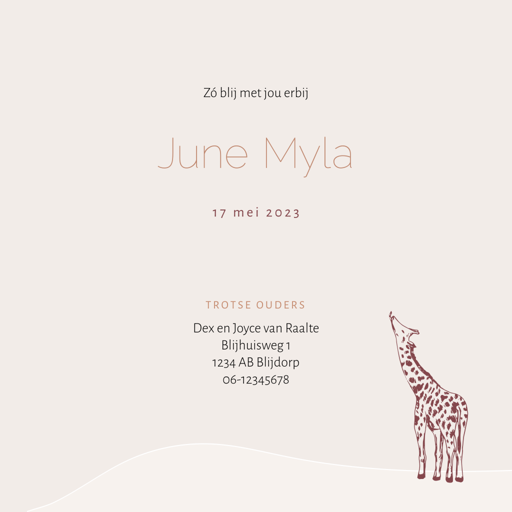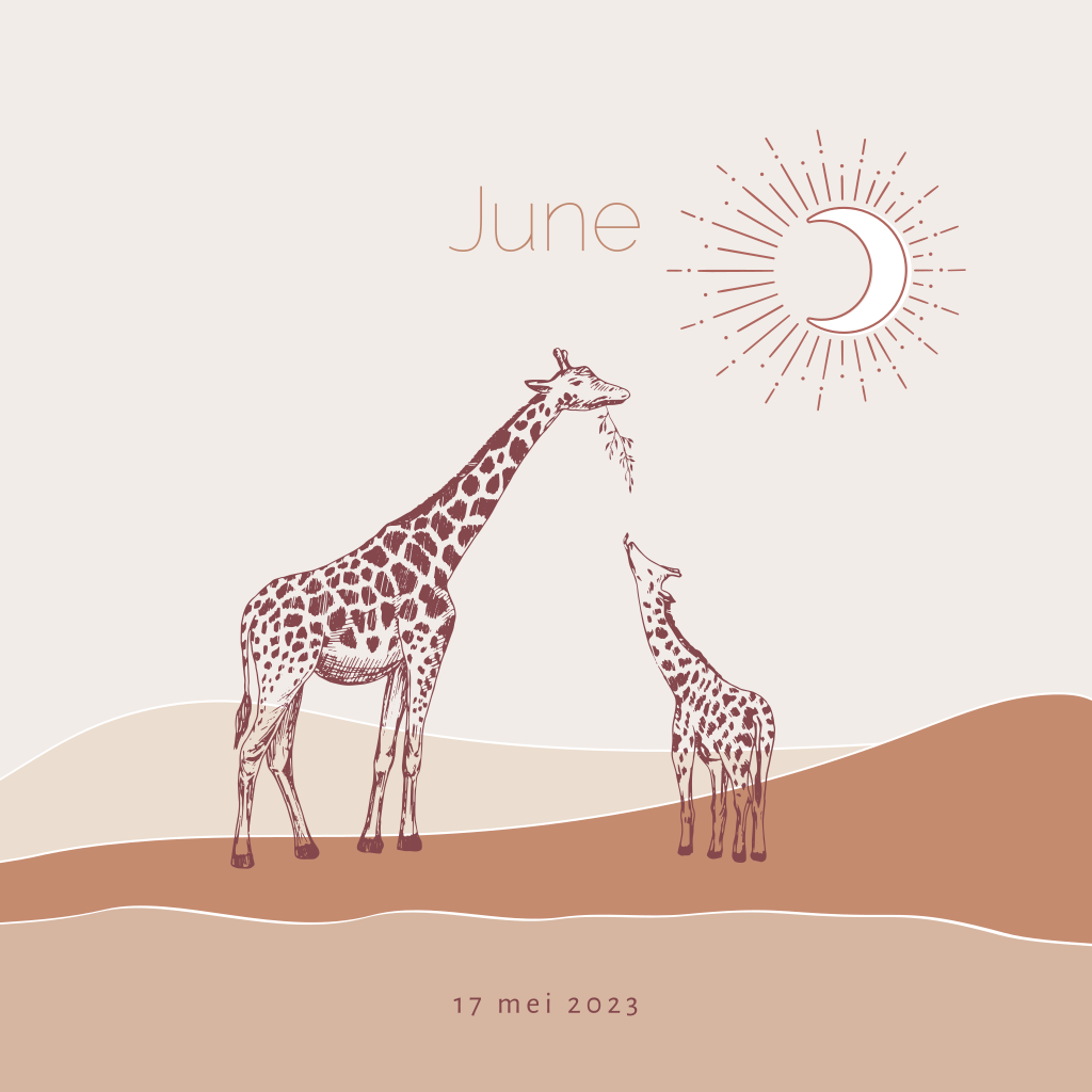 Meisjes geboortekaartje voor een dochter. Op dit babykaartje June zie je 2 giraffen onder een stralende zon en maan. De grote giraf voert het kleine girafje een takje in een heuvelachtig safari landschap.