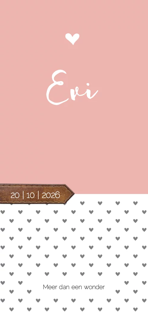 Hip geboortekaartje voor een meisje heeft een mooi look met een stoer tintje. De roze kleur en de hartjes zijn de basis van dit meisjes kaartje. Het leren label geeft de kaart een stoer tintje.