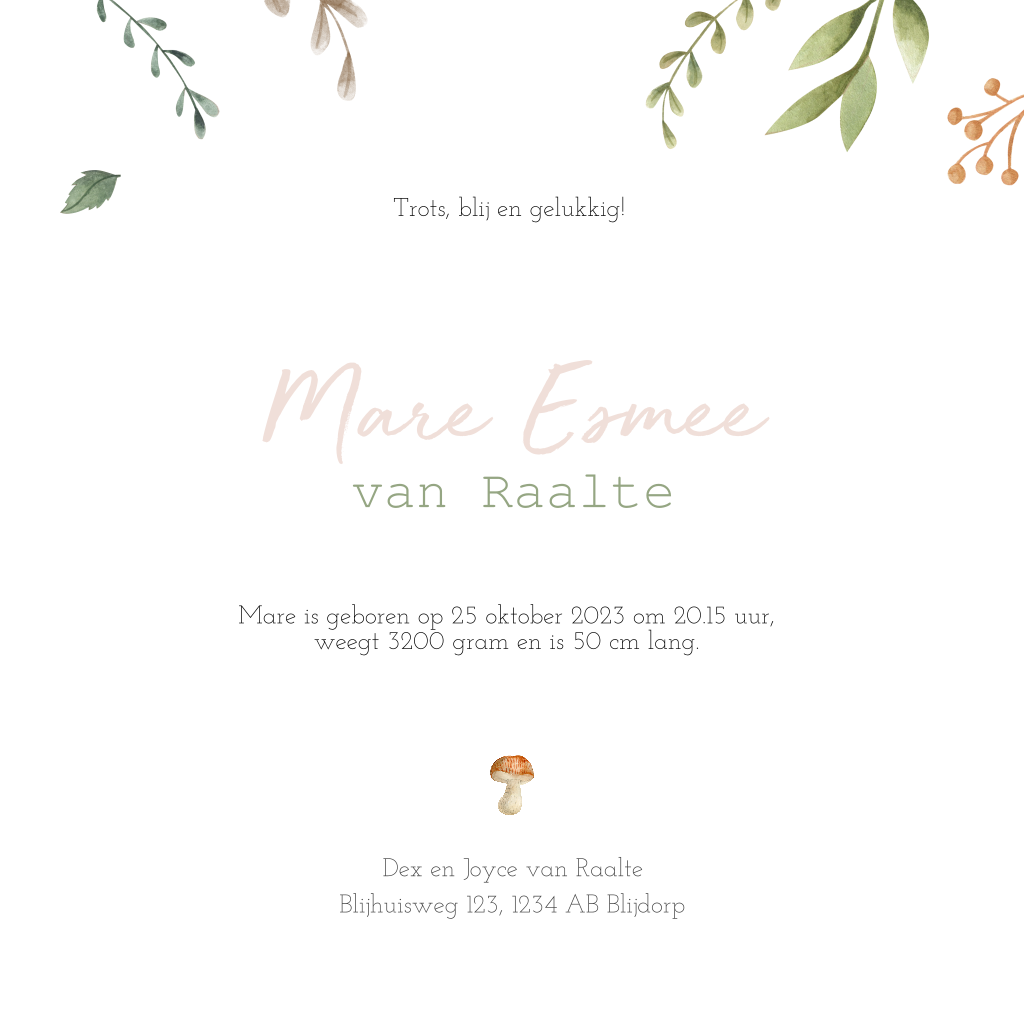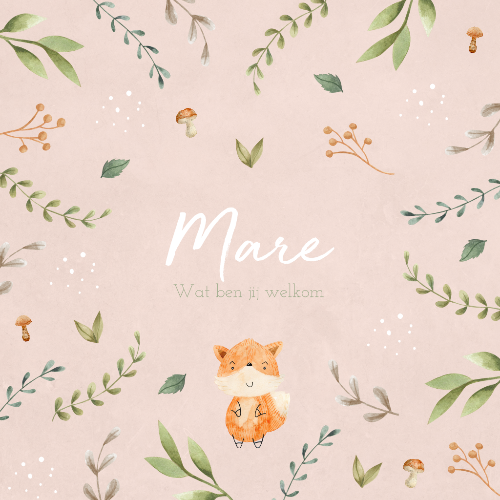 Herfst geboortekaartje voor een meisje met verschillende kleine blaadjes, takjes, paddenstoeltjes en een lief klein vosje. Een mooie combinatie met de achtergrondkleur oud roze. De teksten en kleuren van dit kaartje Mare zijn naar wens aan te passen in de editor.