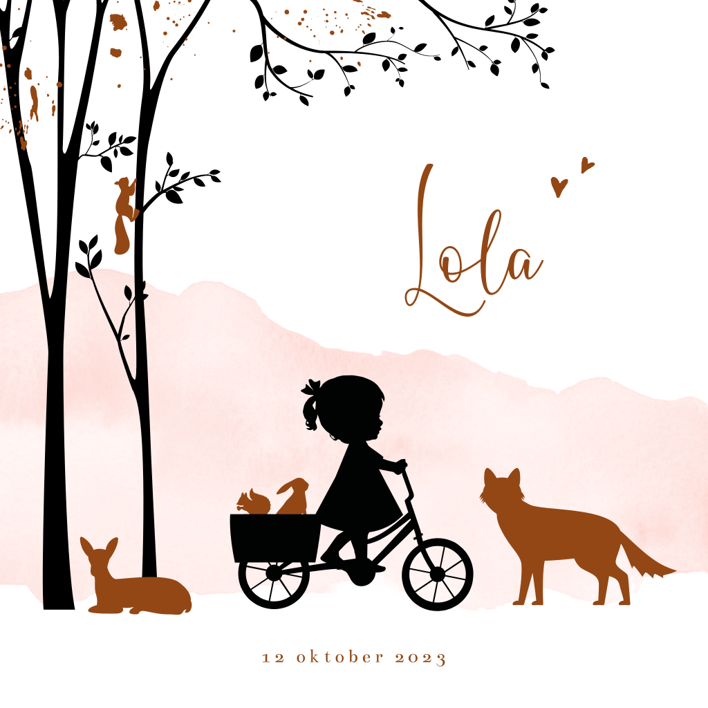 Silhouet geboortekaartje in herfst thema voor een dochter. Op dit kaartje Lola fietst een meisje door het bos. Achterin haar bakfiets een eekhoorn en een konijntje. Naast haar een hertje en een vos. Op de achtergrond een boom en een roze aquarel. Een perfect kaartje voor een meisje dat in de herfst geboren wordt! Teksten en kleuren, evenals het silhouet zijn aan te passen in de editor.