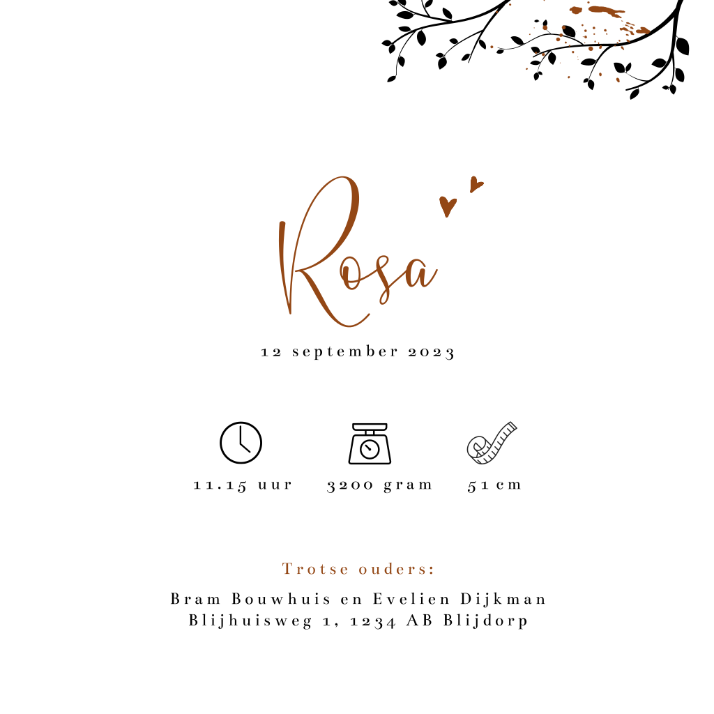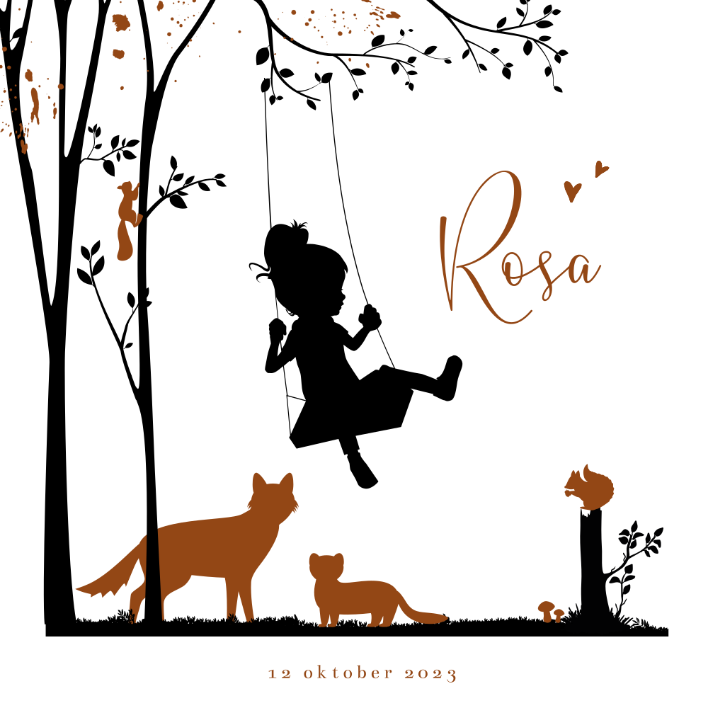 Hip herfst geboortekaartje van een klein meisje op de schommel in het bos. Dit silhouet kaartje Rosa heeft trendy herfstkleuren en afbeeldingen van een boom, vos, eekhoorn en paddenstoeltjes. Op de binnenzijde worden de geboortegegevens weergegeven met symbolen. Teksten en kleuren, evenals het silhouet zijn aan te passen in de editor.