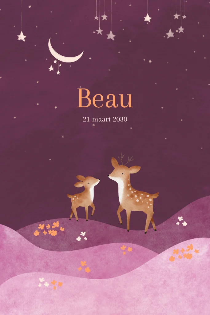 Een lief geboortekaartje voor een meisje. Op dit kaartje Beau zie je een mooi paars heuvellandschap met twee hertjes, een moederhert met haar baby. De nachthemel is donkerpaars met de sterren en de maan. De lichtroze envelop past perfect bij dit geboortekaartje voor jullie dochter.