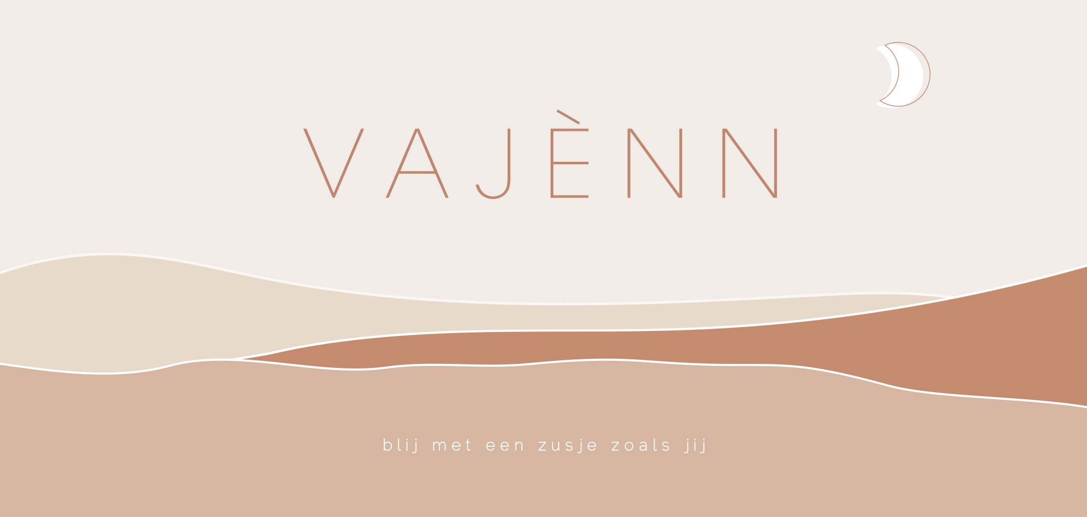 Een geboortekaartje voor een dochter en zusje, met de babynaam Vajènn in strak lettertype. Op dit babykaartje staat een heuvelachtig landschap in trendy kleuren. Teksten en kleuren zijn eenvoudig aan te passen in de editor. Hulp nodig bij het ontwerpen? Laat het ons gerust weten.