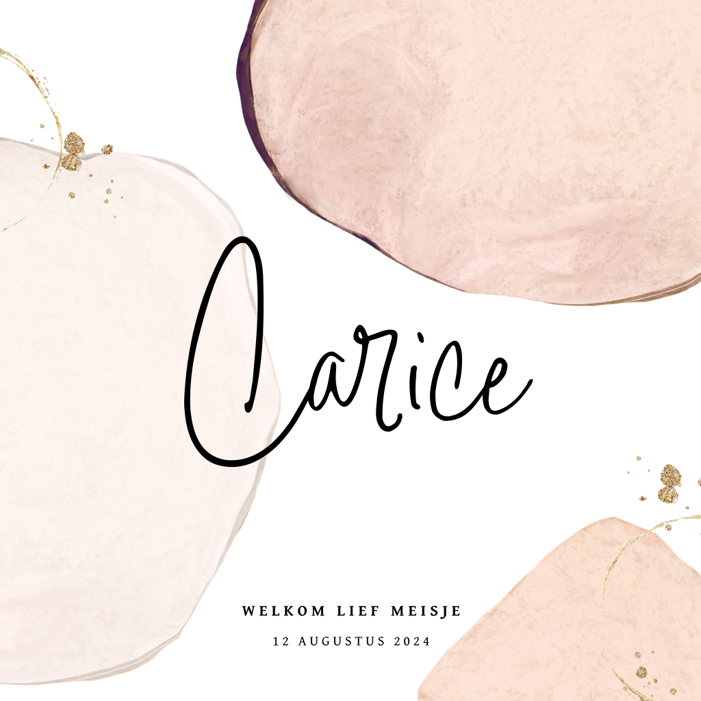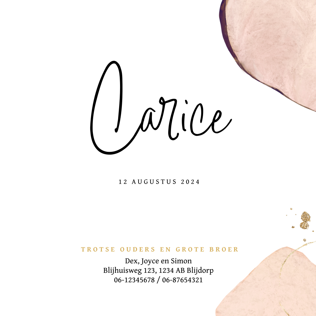 Hip geboortekaartje voor een meisje met mooie abstracte vormen in aquarel. Op dit babykaartje Carice staan de vormen in zachte roze tinten en maken de kleine gouden accenten het kaartje helemaal af. Voor de naam van de baby is een mooi sierlijk lettertype gebruikt. Pas de teksten en kleuren naar je eigen smaak aan in onze editor.