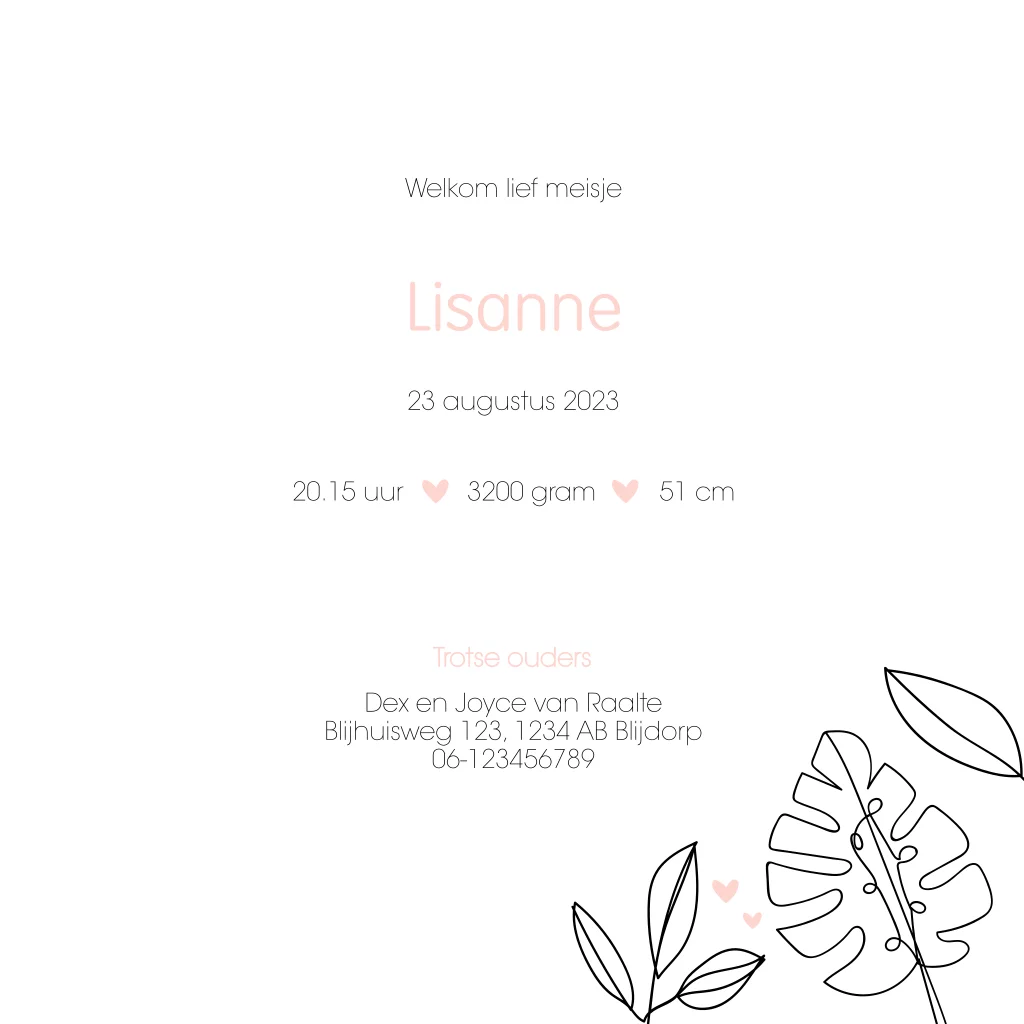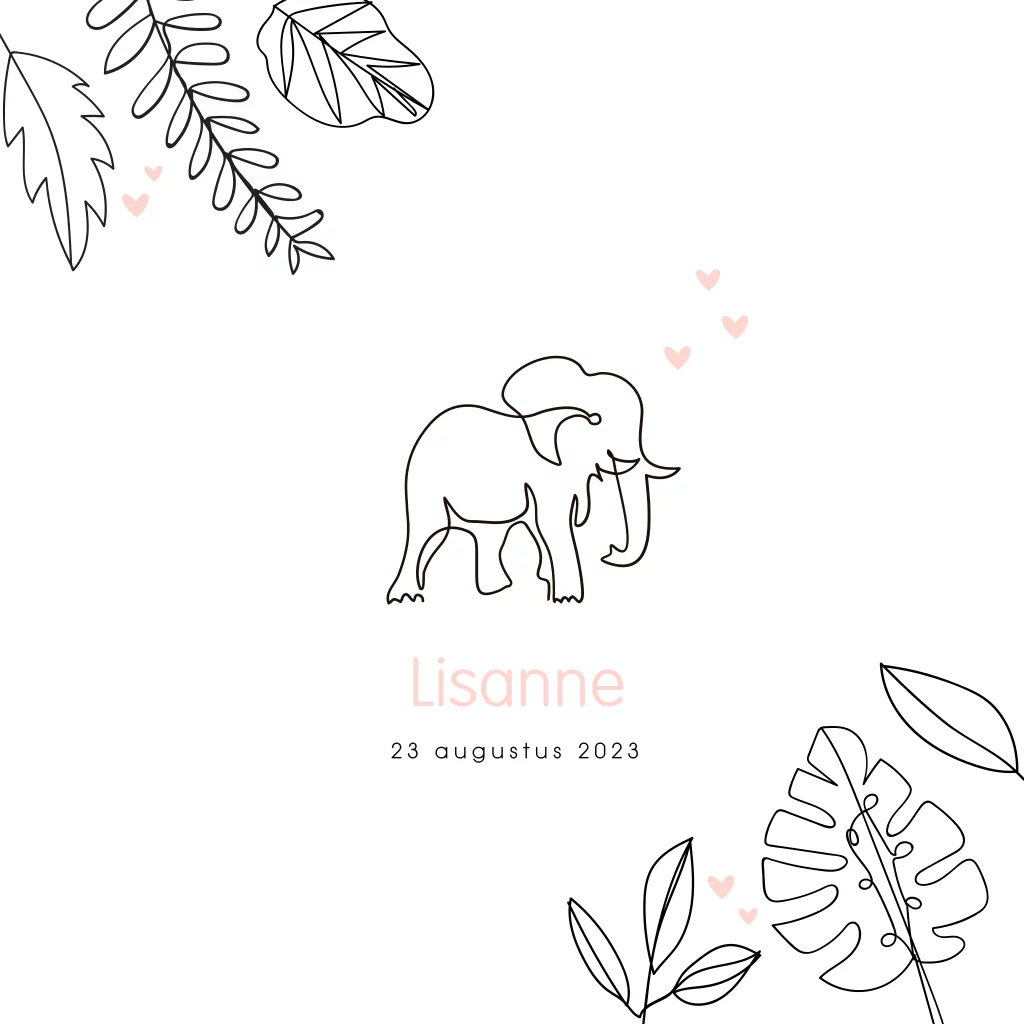 Hip dieren geboortekaartje voor een dochter in zwart wit met zacht roze. Op dit meisjeskaartje Lisanne staat een one line illustratie van een schattig olifantje met enkele verschillende bladeren. De kleine hartjes maken het kaartje helemaal af. Dit kaartje heeft een rustige en lieve uitstraling. Pas het kaartje naar je eigen smaak aan in de editor.