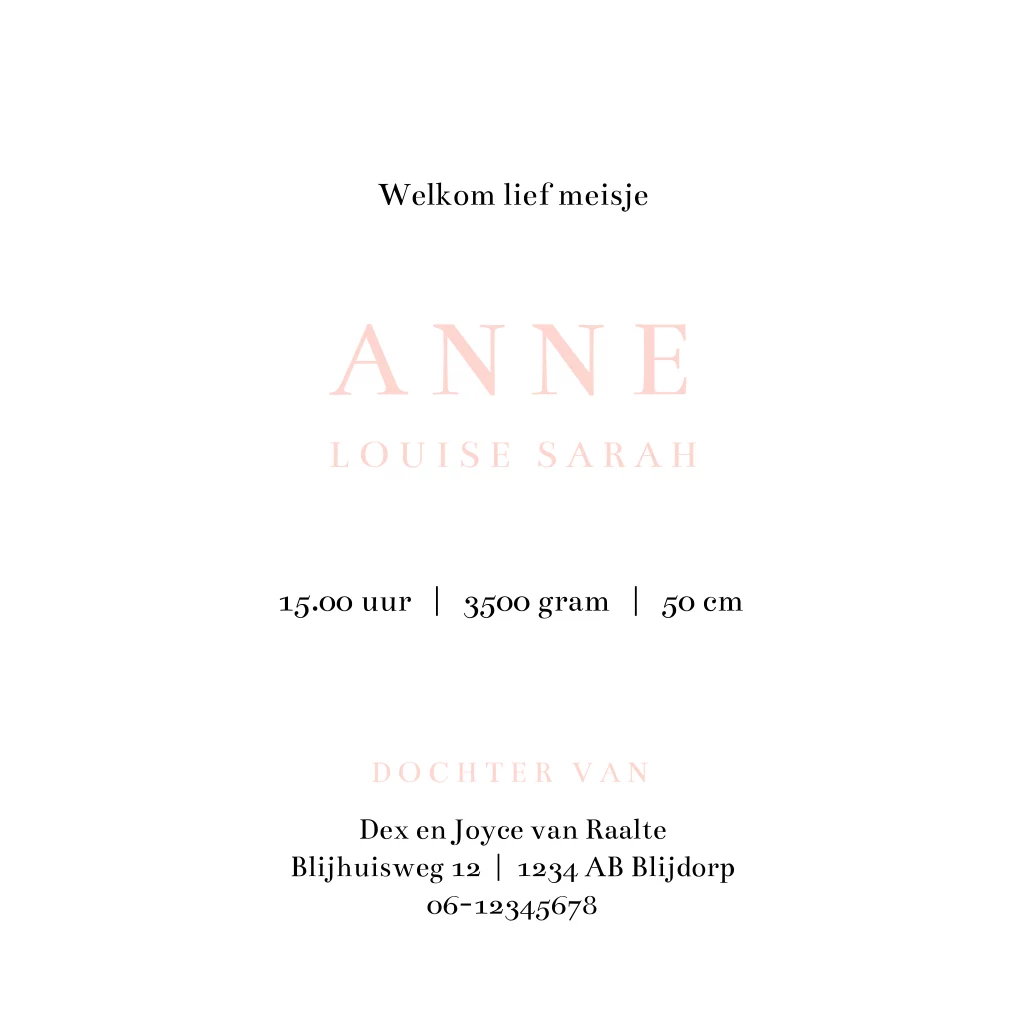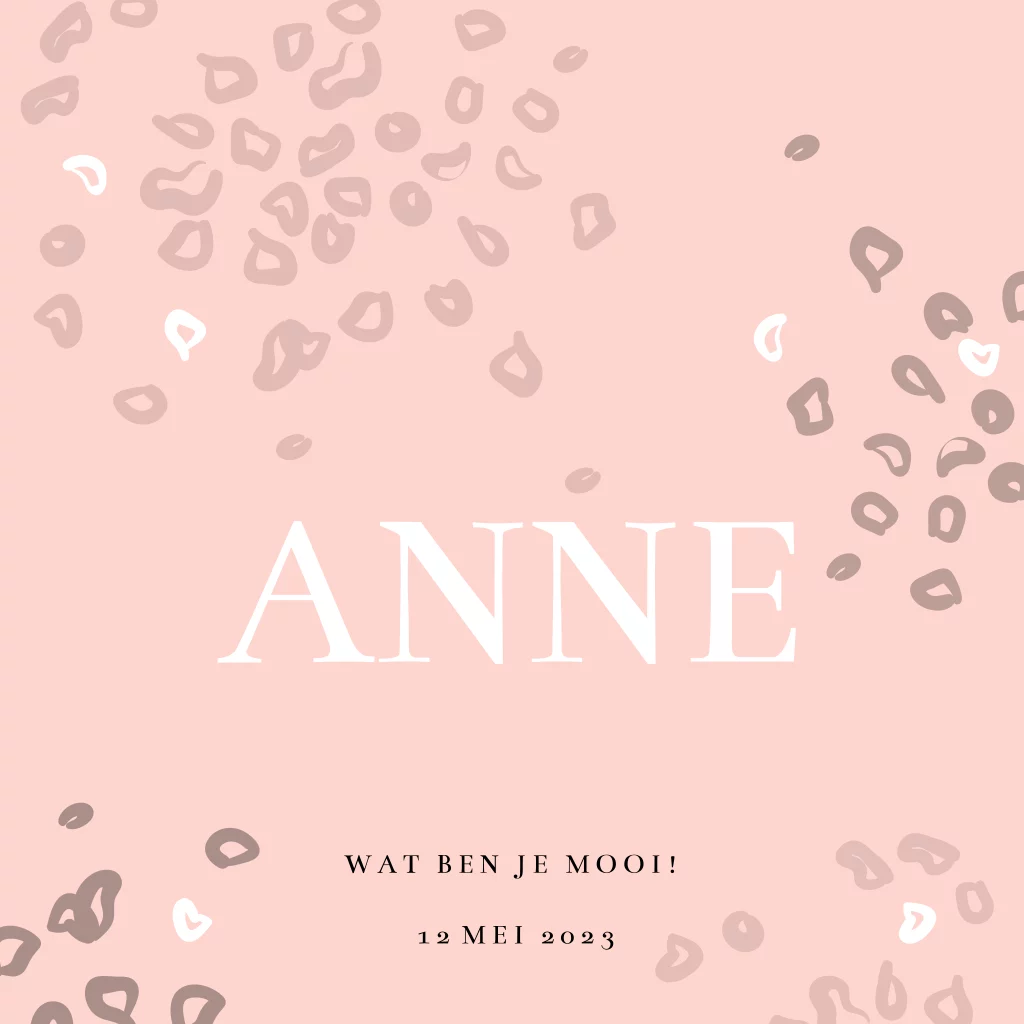Hip geboortekaartje voor een meisje met op de pastel roze achtergrond een dierenprint in verschillende licht tinten. De kleuren en lettertypes van dit kaartje Anne zijn aan te passen in de editor.