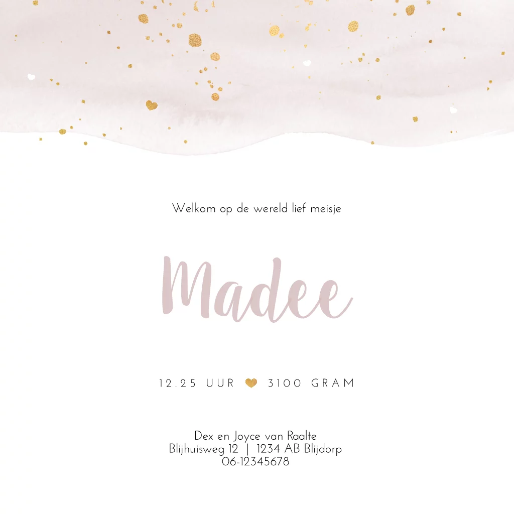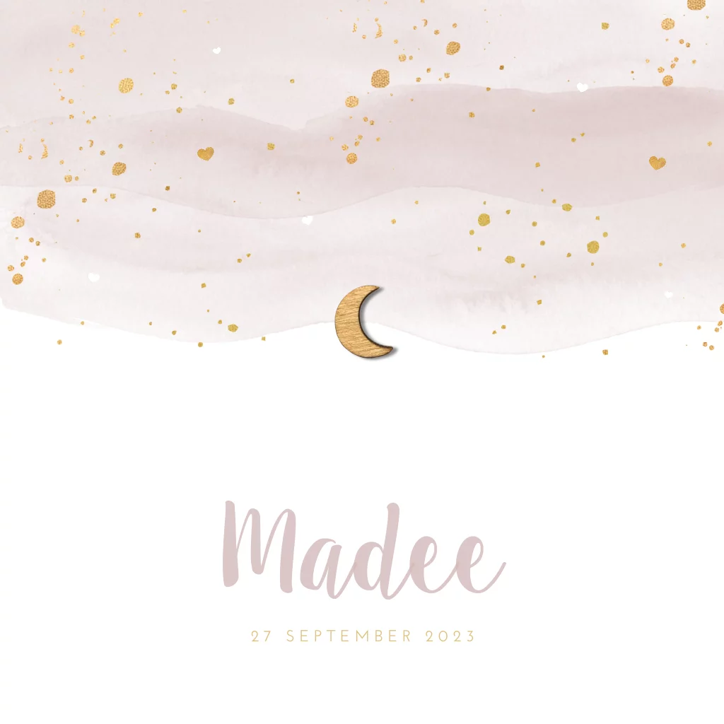 Lief geboortekaartje Madee voor een meisje met zachte kleuren en aquarel.