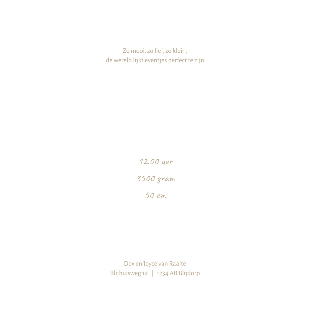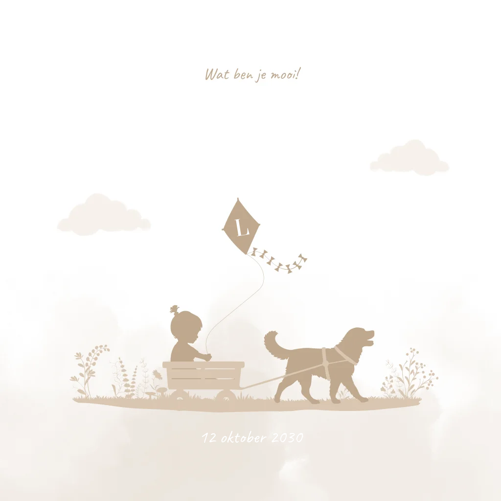 Prachtig aquarel silhouet geboortekaartje in beige tinten met foliedruk voor een meisje. Op dit geboortekaartje Linde zie je een silhouet van een baby meisje in een kar, ze heeft een vlieger vast met haar voorletter erop in goudfolie. Een hond trekt de kar voort. Een leuke manier om jullie viervoeter te betrekken bij de komst van de baby. Foliedruk geboortekaartjes zijn een echte eyecatcher en staan garant voor een unieke uitstraling.