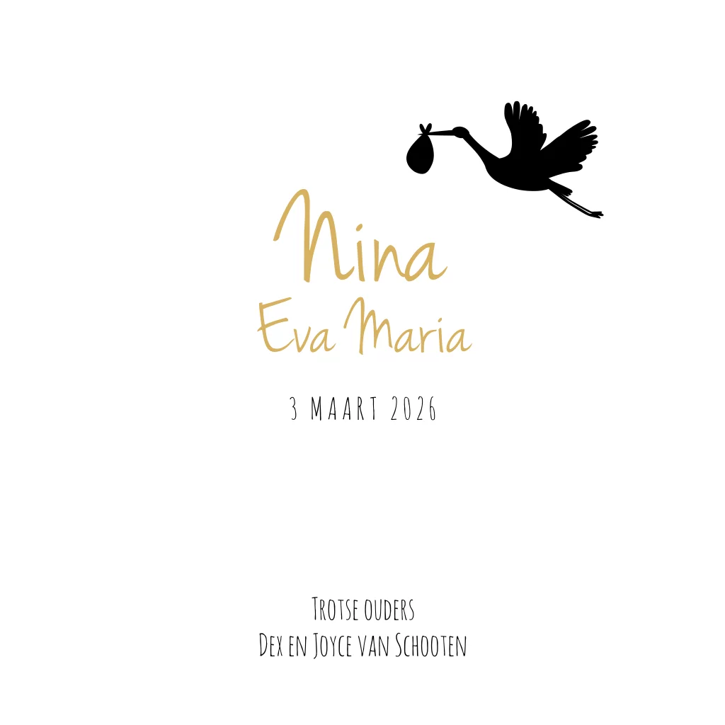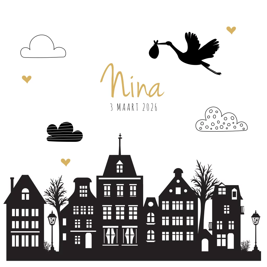 Geboortekaartje in zwart wit voor een meisje. Op dit kaartje staan huisjes, wolkjes en een overvliegende ooievaar. Wat subtiele goudkleurige hartjes maken de kaart compleet.
