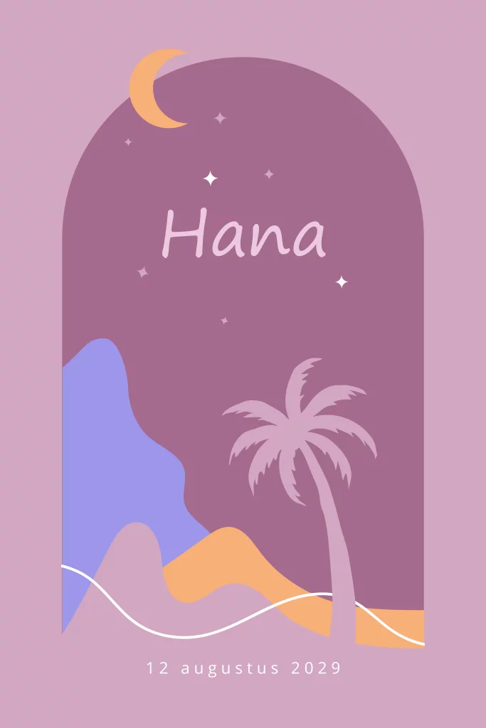 Prachtig geïllustreerd geboortekaartje voor een meisje. Dit Arabische geboortekaartje Hana heeft afgeronde hoeken met een boogvormig kader met daarin een woestijn landschap met palmboom, maan en sterren. In de online editor kun je dit islamitische geboortekaartje naar eigen wens aanpassen. Met de bijpassende envelop en sluitzegel maak je het geboortekaartje helemaal af.