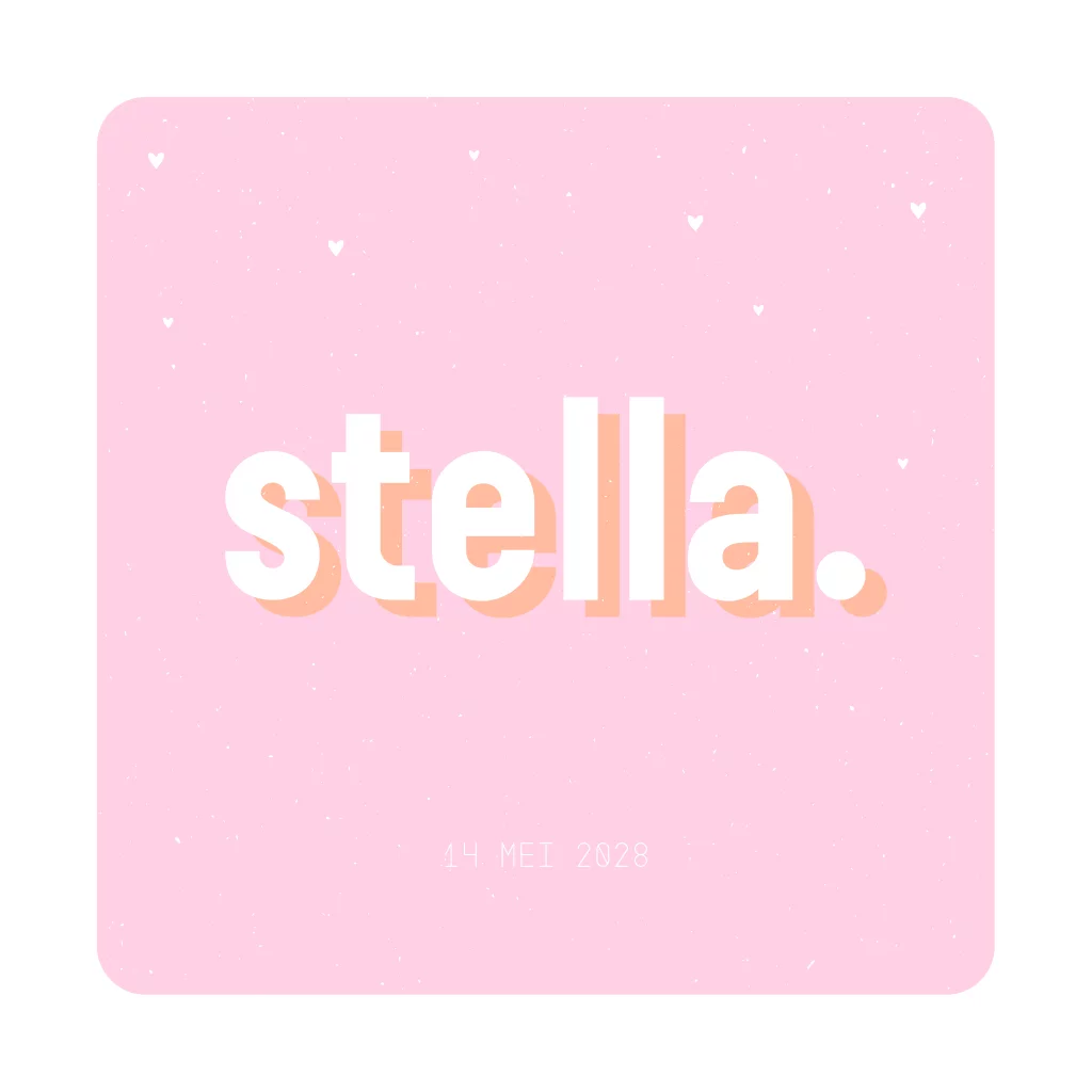 Een fantastisch, kleurrijk geboortekaartje voor jullie dochter! Op dit kaartje zie je een kader met afgeronde hoeken in een roze kleur. In dit kader zie je verschillende hartjes en de babynaam Stella in 3D staan. Pas dit geboortekaartje voor jullie meisje naar eigen wens aan in onze online editor en maak het kaartje af met de lichtroze envelopkleur.