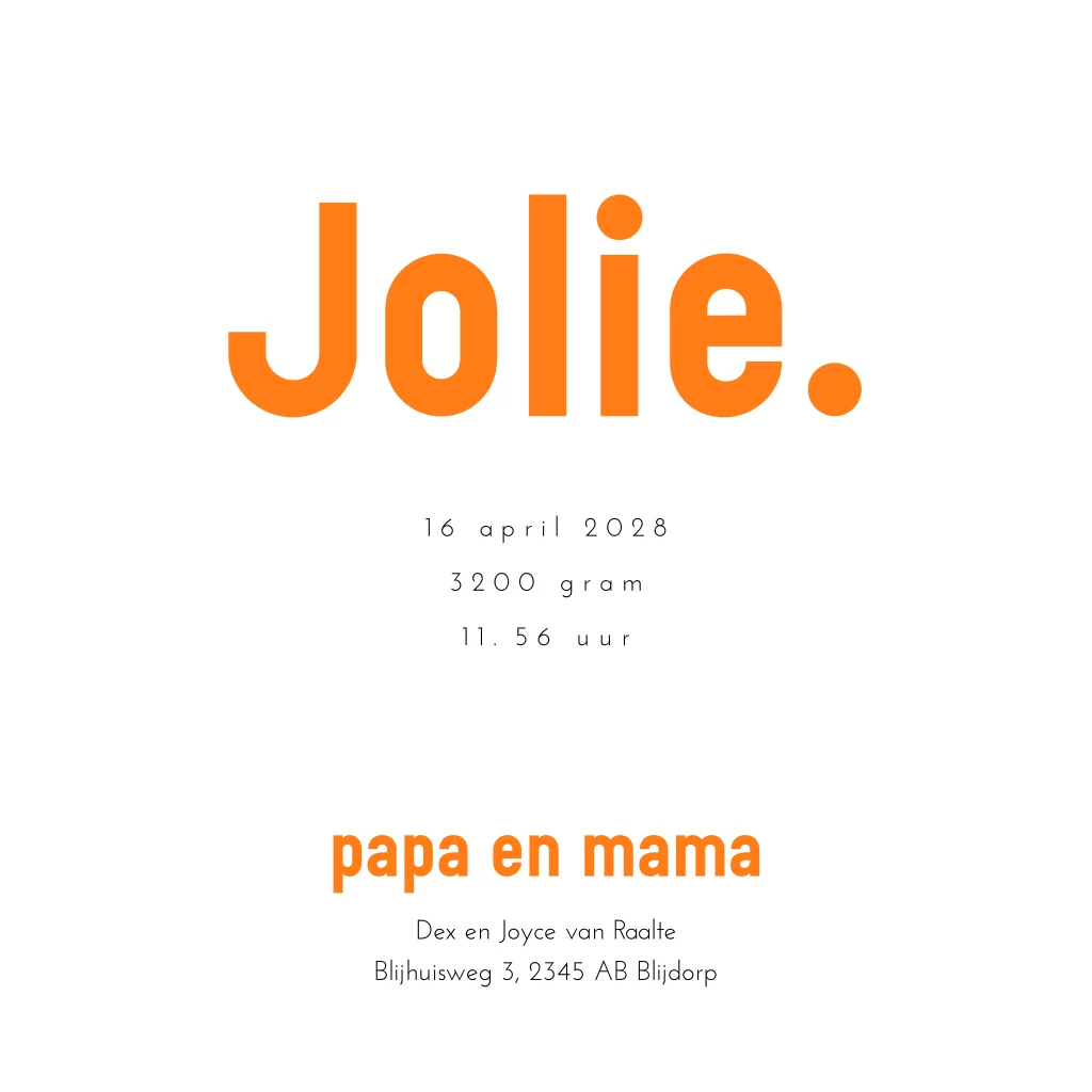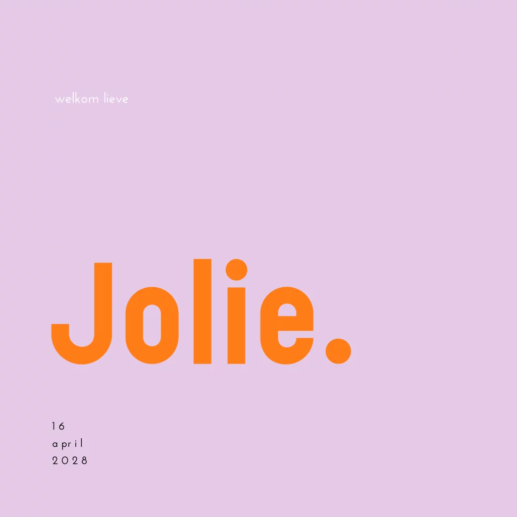 Een kleurrijk, basic geboortekaartje voor een meisje! Dit geboortekaartje Jolie heeft kleurrijke tinten. De babynaam in de oranjekleur van jullie dochter spat van het kaartje af. Pas dit kaartje met roze achtergrond naar eigen wens aan in onze online editor en laat een kleurrijke indruk achter bij jullie vrienden en familie.
