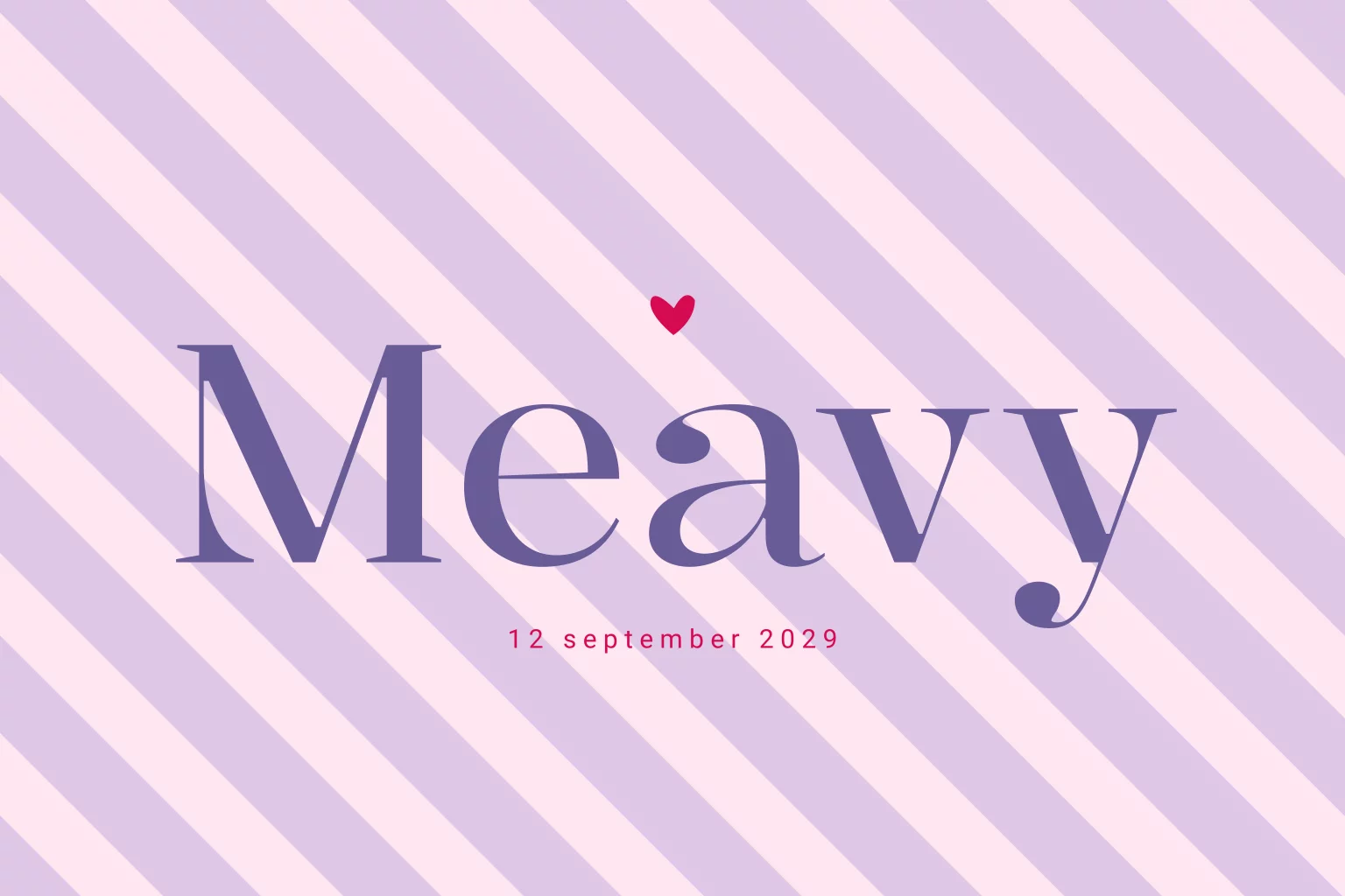 Een prachtig opvallend geboortekaartje voor een meisje met een gestreepte achtergrond. Dit geboortekaartje Meavy is een prachtige keuze voor de aankondiging van de geboorte van jullie dochter. Pas dit kaartje naar eigen wens aan in onze online editor. Laat jullie blijdschap zien met dit kleurrijke geboortekaartje!