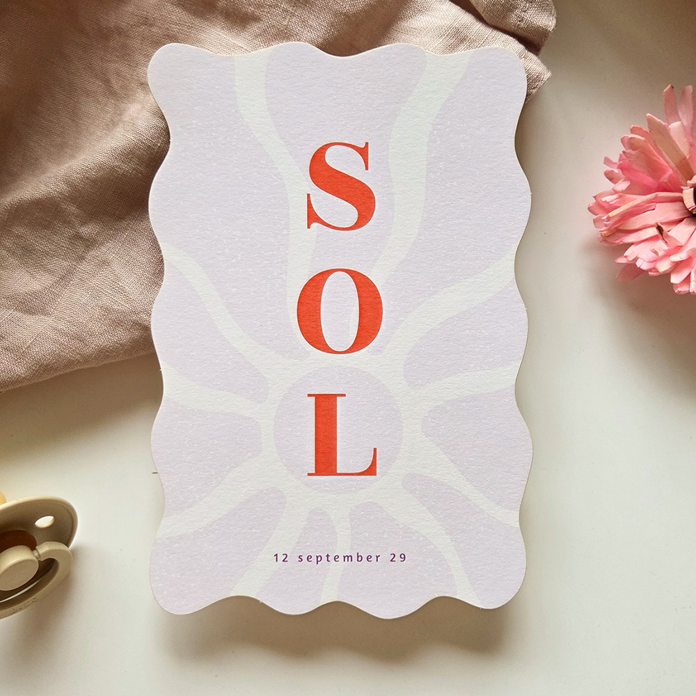 Origineel en vrolijk geboortekaartje voor een meisje. Dit geboortekaartje Sol heeft een aparte golvende vorm. Op het kaartje staat een organische zon met een lila paarse achtergrond. Pas de kleuren, lettertypes en teksten eenvoudig aan in de editor.