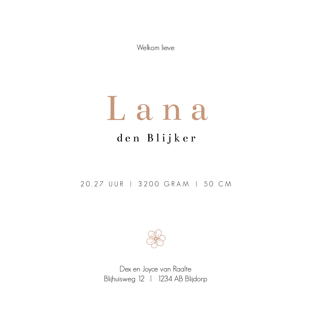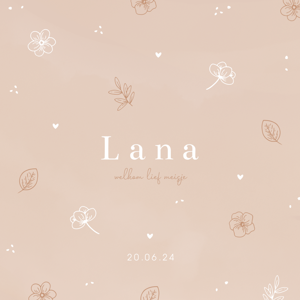 Lief geboortekaartje voor een meisje met kleine bloempjes, takjes en blaadjes. Op de achtergrond een mooie oud roze kleur met een lichte aquarel veeg. De kleine hartjes maken het kaartje af. Pas dit kaartje Lana naar je eigen smaak aan in de editor.