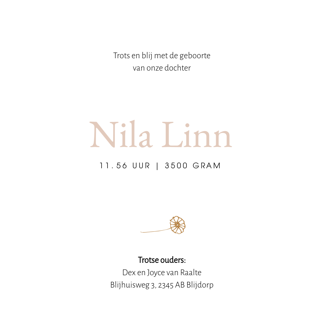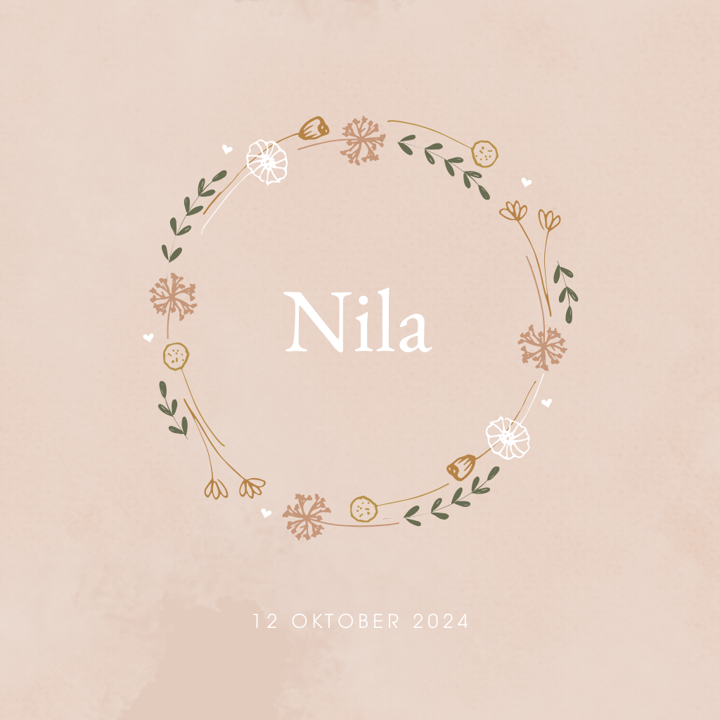 Lief geboortekaartje voor een dochter. Op de achtergrond een trendy oud roze kleur met een watercolor effect. De naam Nila komt in het wit mooi naar voren. Om de naam van de baby staan mooie bloemetjes en takjes in de vorm van een cirkel. Je kunt dit kaartje gemakkelijk zelf bewerken in de editor om het naar je eigen smaak aan te passen.