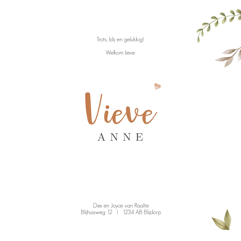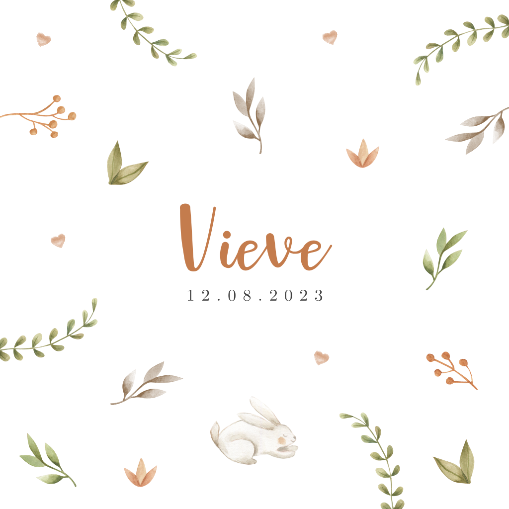 Clean geboortekaartje voor een meisje met kleine takjes, hartjes en een lief konijntje. De teksten en kleuren van dit kaartje Vieve zijn aan te passen in de editor.