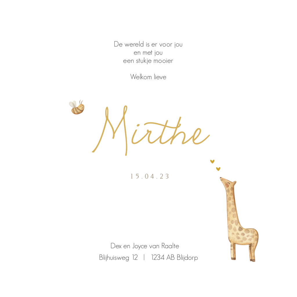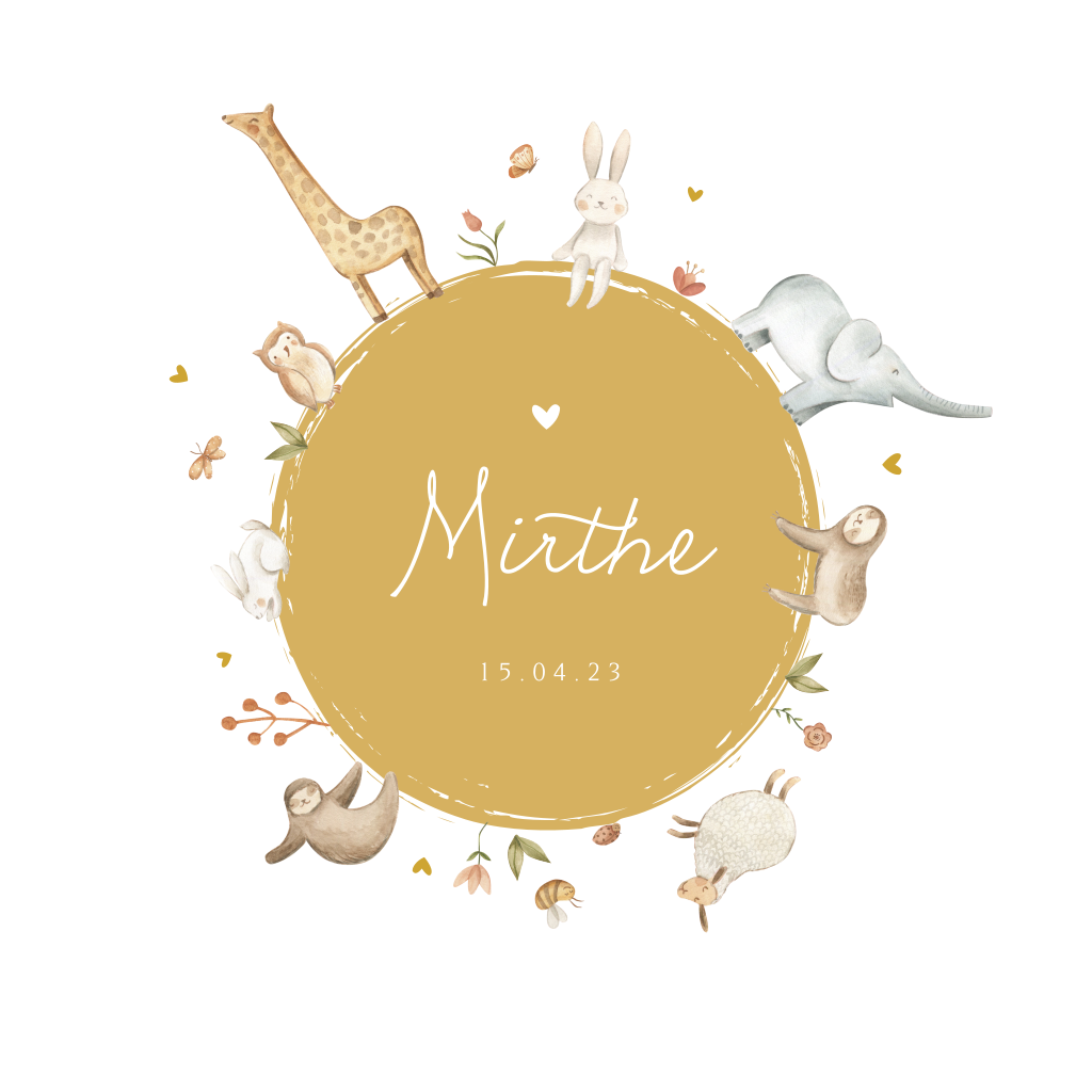 Lief geboortekaartje voor een dochter met verschillende vrolijke aquarel dieren op een wereldbol, waaronder een olifantje, konijntje, giraffe, schaapje en uiltje. De teksten en kleuren van dit meisjeskaartje Mirthe zijn aan te passen in de editor.