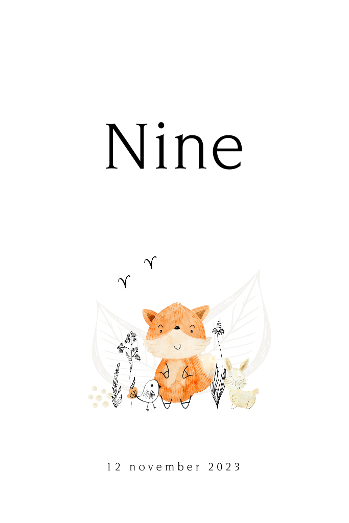 Geboortekaartje voor een meisje met een lief klein vosje, konijntje en een vogeltje. Om de dieren heen kleine bloem takjes en blaadjes. Dit kaartje Nine is overwegend wit en oogt clean en rustig. De teksten en lettertypes zijn aan te passen in de editor.