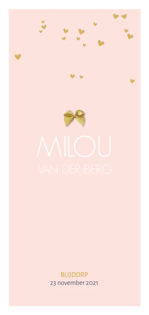 Lief en hip geboortekaartje voor een meisje met een wit kader, vallende hartjes en op de achterkant geboorte symbolen. Het ontwerp van dit babykaartje komt helemaal tot zijn recht op het langwerpig staande formaat. Het strikje op de kaart wordt niet gedrukt, maar kun je als optie er los bij bestellen.