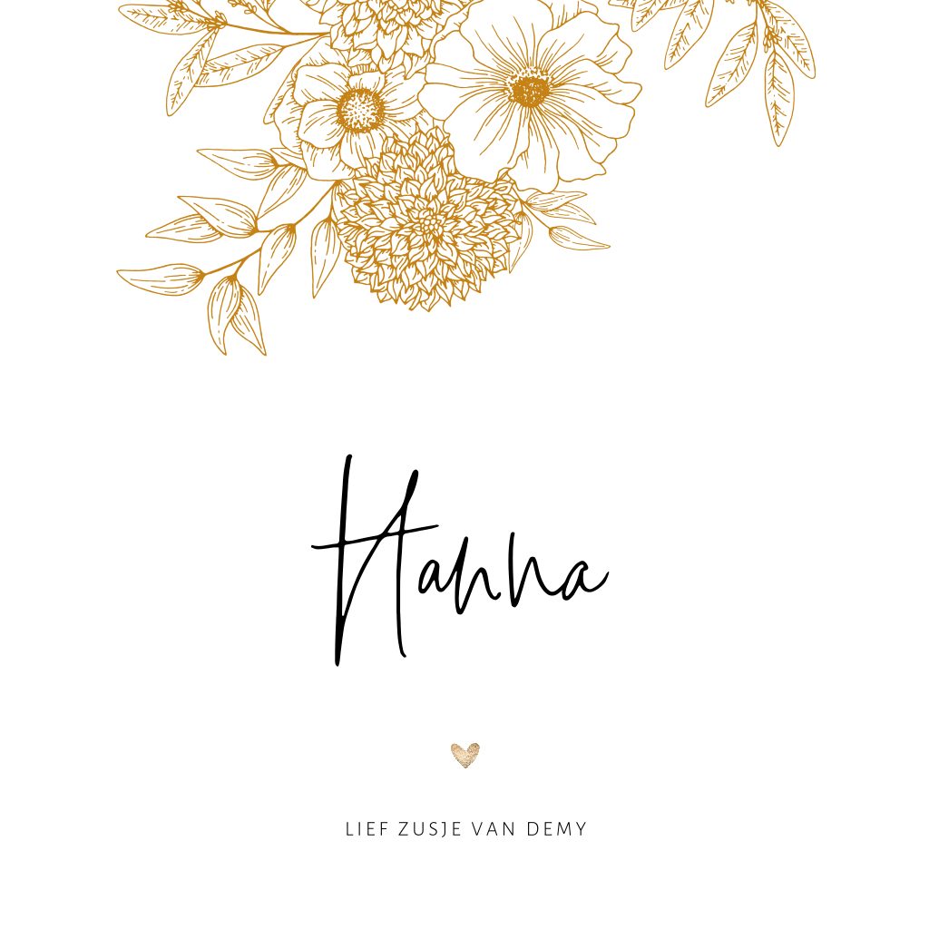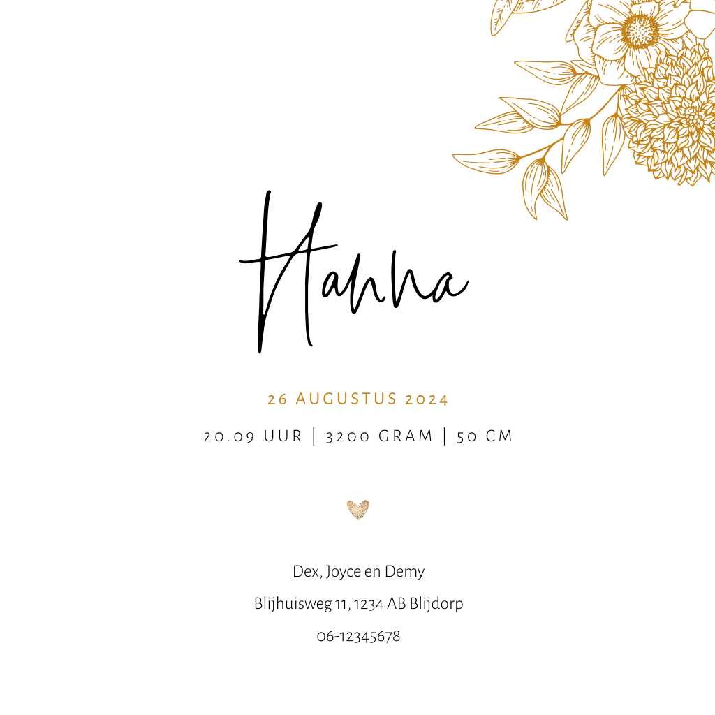 Lief hip geboortekaartje voor een meisje met bloemen en gouden hartje. De naam Hanna staat in een sierlijk lettertype geschreven.
