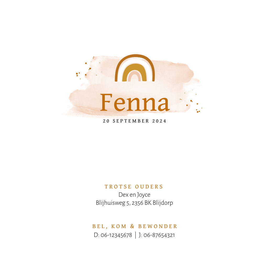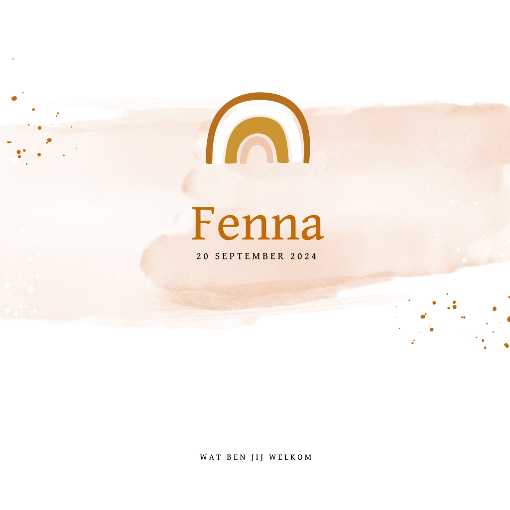 Hip geboortekaartje voor een meisje met een kleine regenboog en trendy kleuren. Op de achtergrond een aquarel veeg en kleine spetters. Dit meisjeskaartje Fenna heeft een lieve uitstraling en kun je naar je eigen smaak aanpassen in de editor. Combineer met een mooie roestbruine envelop om het helemaal af te maken!