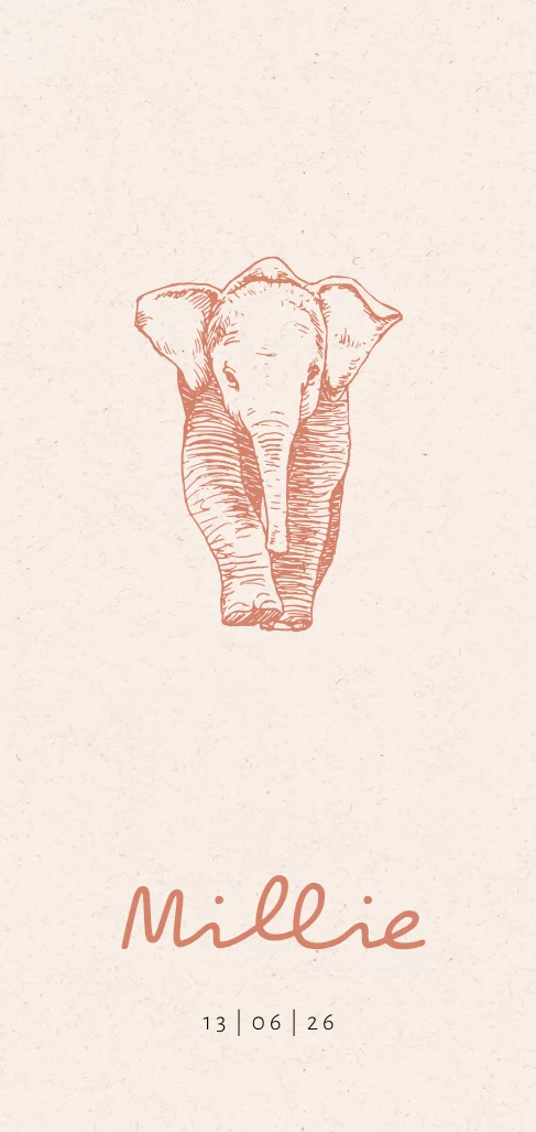Lief en rustig dieren geboortekaartje voor een meisje. Op dit babykaartje Millie staat een getekende olifant en is gebruik gemaakt van een trendy kleurencombinatie roestbruin. De kaart is overwegend off-white en oogt daardoor clean. Pas dit kaartje naar je eigen smaak aan in onze editor.