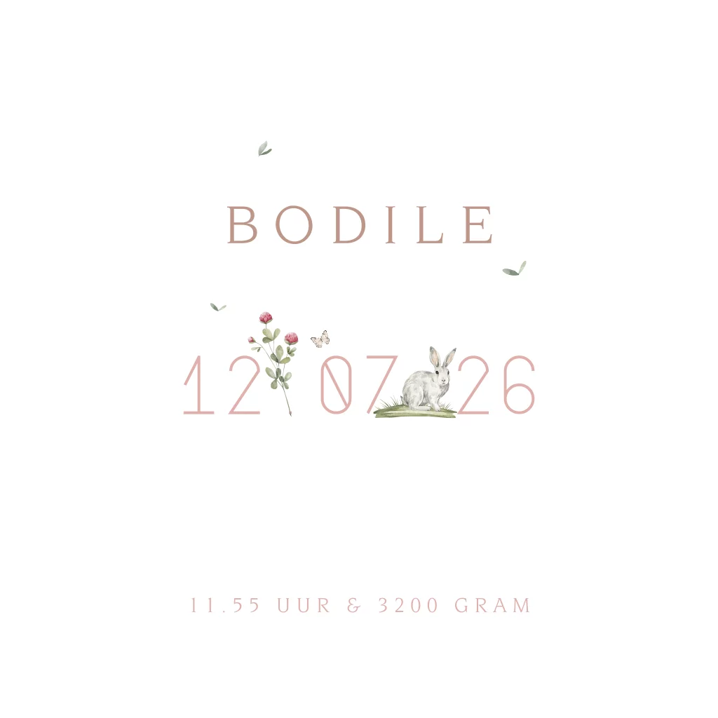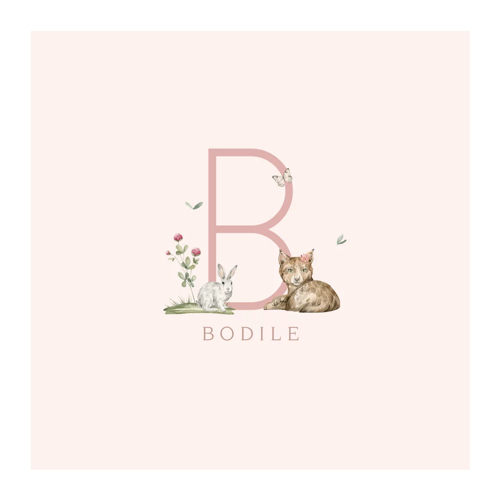 Lief geboortekaartje Bodile voor een meisje waarop de eerste letter van de babynaam centraal staat. Bij de initiaal een lieve lynx en een klein konijntje. Teksten, kleuren en de voorletter kun je gemakkelijk aanpassen in de editor.