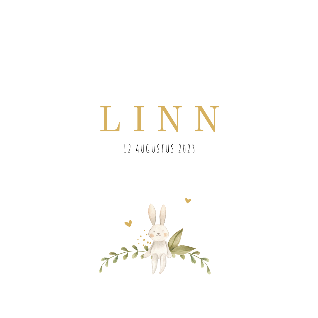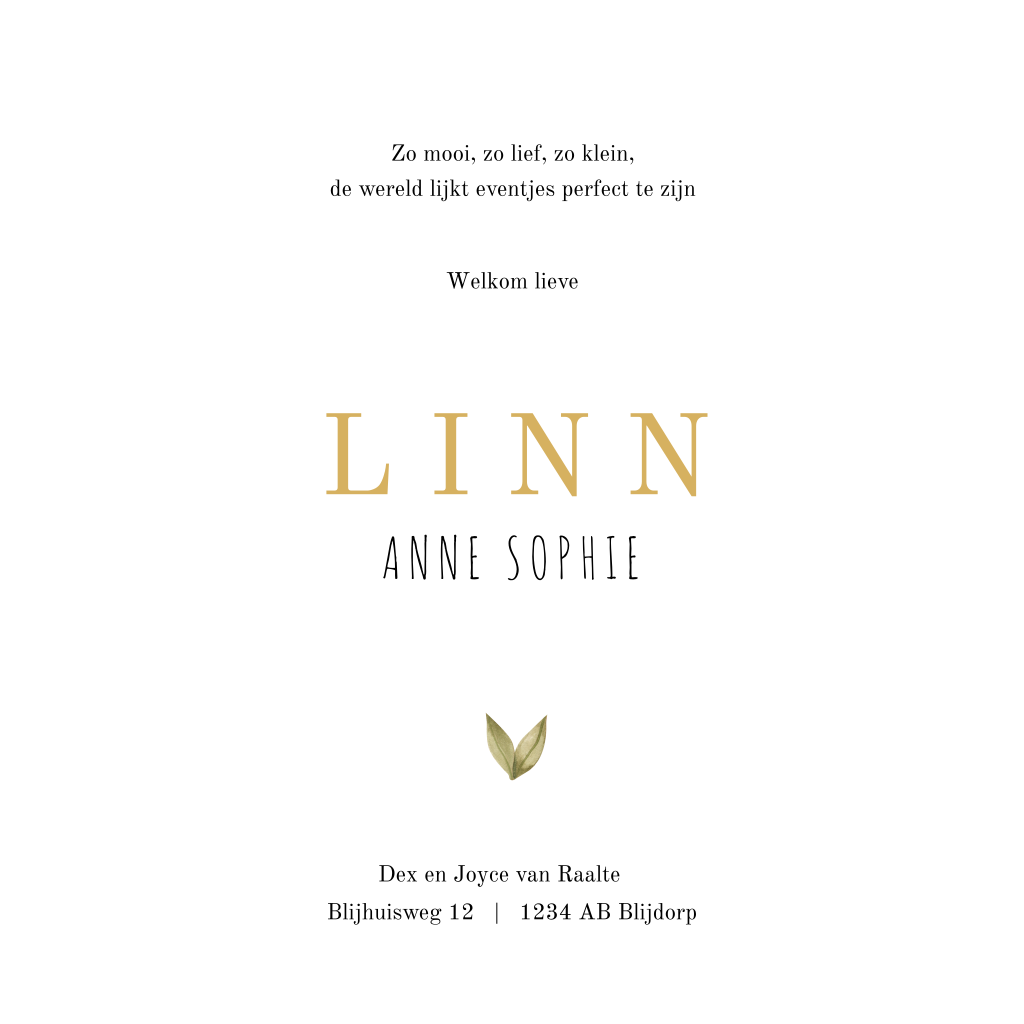 Lief geboortekaartje voor een meisje. Dit kaartje Linn heeft een rustig design. Wil je meer of andere afbeeldingen toevoegen passend bij dit thema, dan kun je deze afbeeldingen in de editor vinden in het mapje: Thema Lief Aquarel.