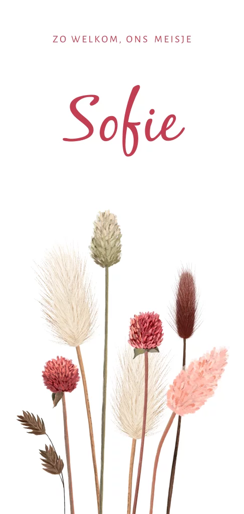 Trendy geboortekaartje voor een meisje met mooie gedroogde veldbloemen, zoals klaver en graspluimen. Op de witte achtergrond komen de zachte kleuren van de droogbloemen extra mooi uit. Pas dit kaartje Sofie aan naar je eigen wens in onze editor.
