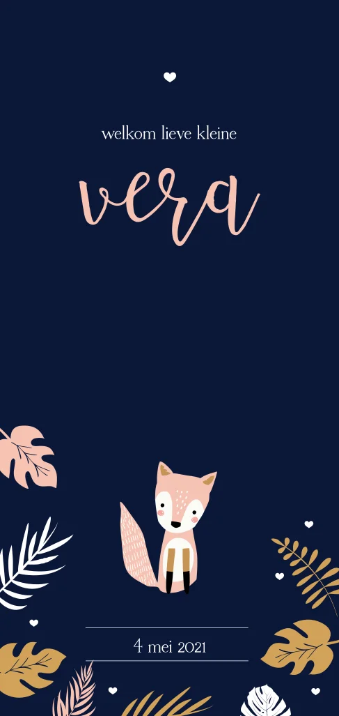 Dit geboortekaartje is speciaal voor een meisje. Het vosje in de kleur oudroze maakt het extra schattig. Wil je liever geen oudroze of oker geel. laat het ons dan even weten. Wij passen de kaart graag voor je aan.