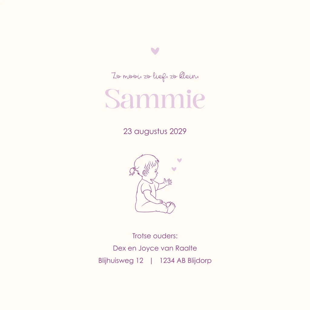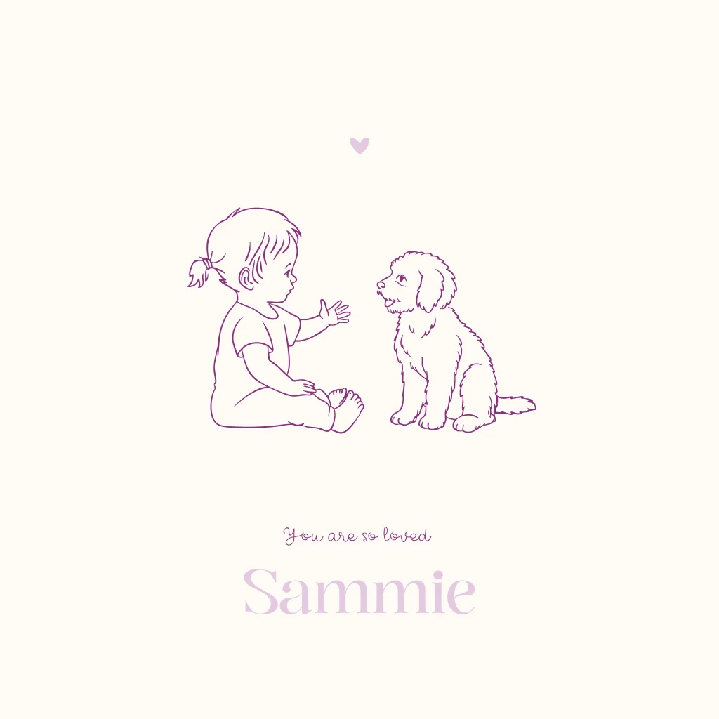 Geboortekaartje voor een meisje met een lijntekening van een meisje en haar huisdier. Betrek het harige gezinslid, jullie lieve hond, bij het geboortekaartje met dit mooie geboortekaartje Sammie. Het kaartje heeft een rustige beige achtergrond met in paars de lijntekening en de naam van jullie dochter.