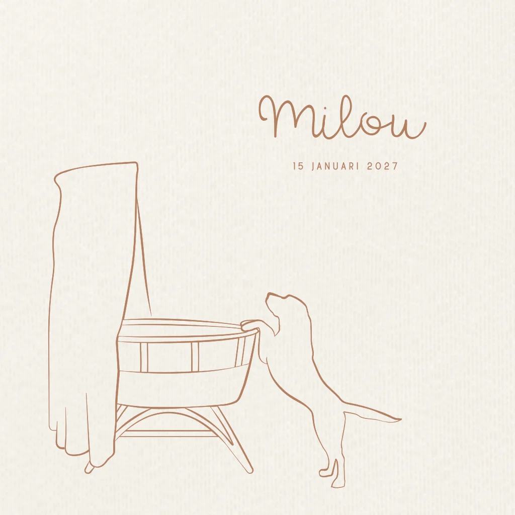 Dit rustige beige geboortekaartje is perfect voor een meisje. Op dit geboortekaartje Milou zie je een lijntekening van een wiegje met een hond. Perfect voor een gezin met een hond. Pas de teksten, kleuren en lettertypes naar je eigen smaak aan in de editor.