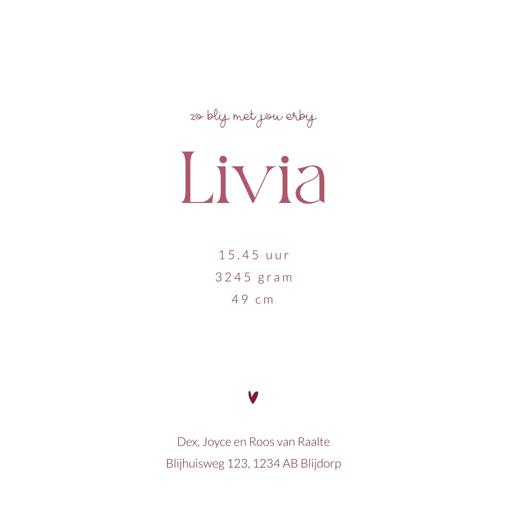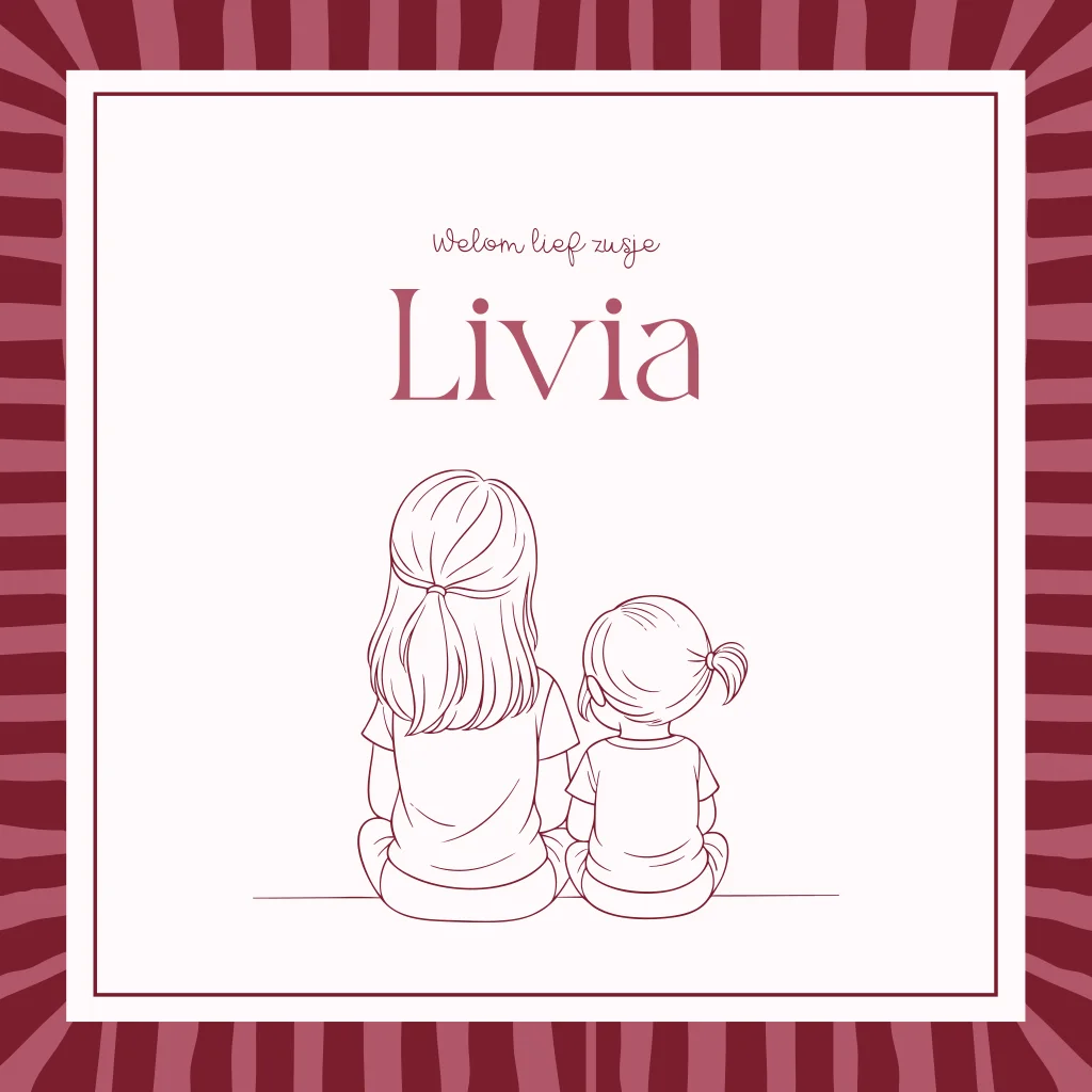 Lief geillustreerd geboortekaartje voor een tweede kindje, een meisje. Dit geboortekaartje Livia heeft een kader van strepen in de trendy kleurencombinatie van rood met roze. In het midden van dit geboortekaartje zie je een lijntekening van twee zusjes, een grote zus met haar kleine zusje. Een lijntekening op maat is ook mogelijk. Vraag gerust naar de mogelijkheden via info@blijkaartje.nl.