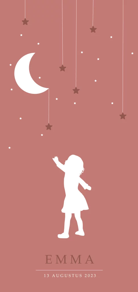 Hip geboortekaartje voor een meisje. Op dit kaartje Emma staat het silhouet van een meisje kijkend naar de maan en de sterren. Een mooie combinatie van donker oudroze met wit. Op de achterzijde worden de geboortegegevens weergegeven met symbolen. Teksten en kleuren zijn aan te passen in de editor.