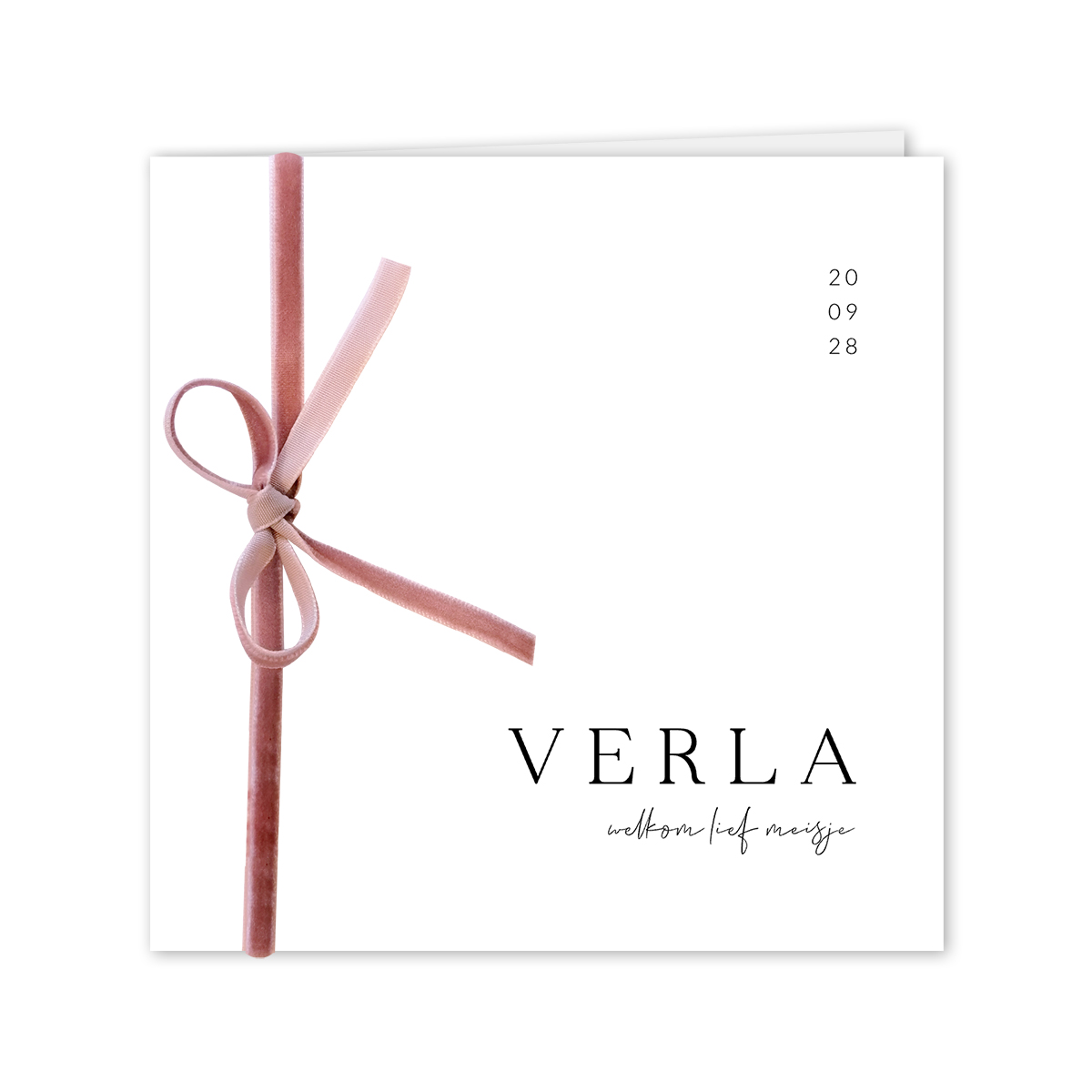 Klassiek geboortekaartje voor een meisje. Dit basic kaartje Verla is uniek door het fluwelen velours oudroze lint waarmee je een strik op de kaart kan maken. Het lintje kun je apart erbij bestellen. Deze wordt niet standaard meegeleverd maar is hier bij te bestellen.