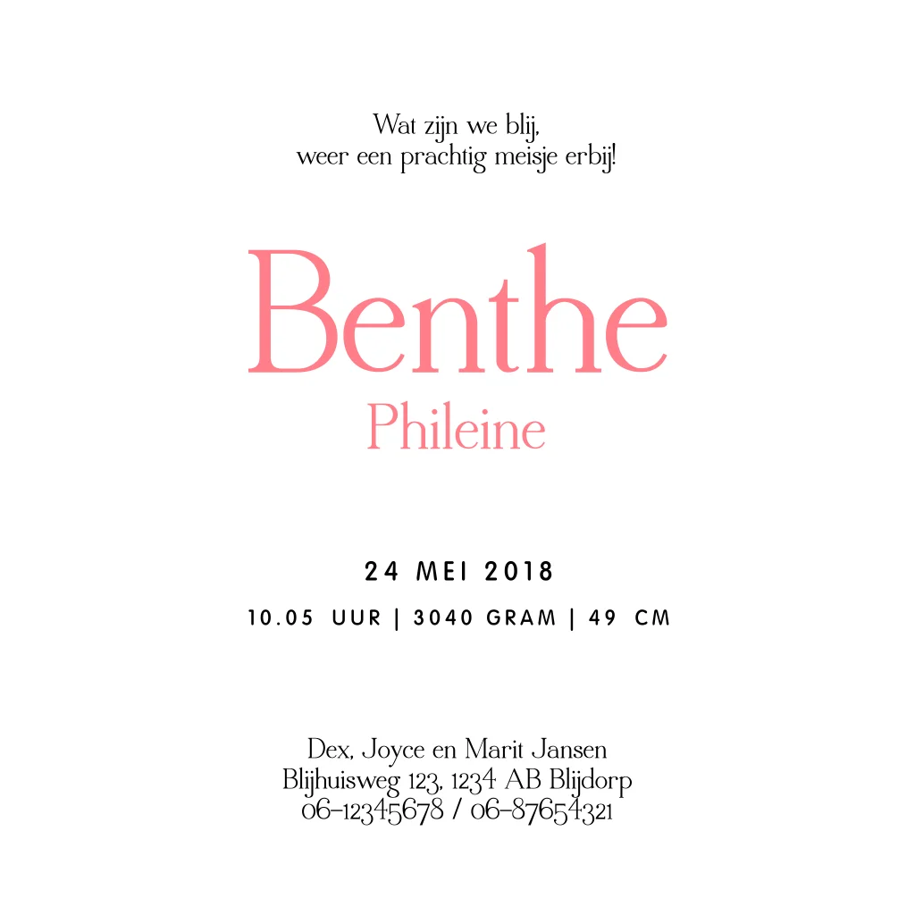 Klassiek geboortekaartje voor een meisje met een hartje in goudlook. De babykaart is bescheiden gehouden waardoor de naam Benthe mooi uit komt. Deze rustige kaart is gemakkelijk aan te passen.