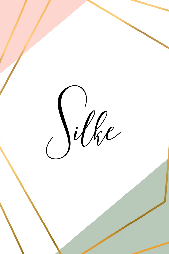 Modern geboortekaartje voor een meisje met schuine vlakken in hippe kleuren. Over de schuine vlakken liggen goudkleurige geometrische lijnen. Op dit babykaartje Silke staat de naam centraal in een sierlijke letter