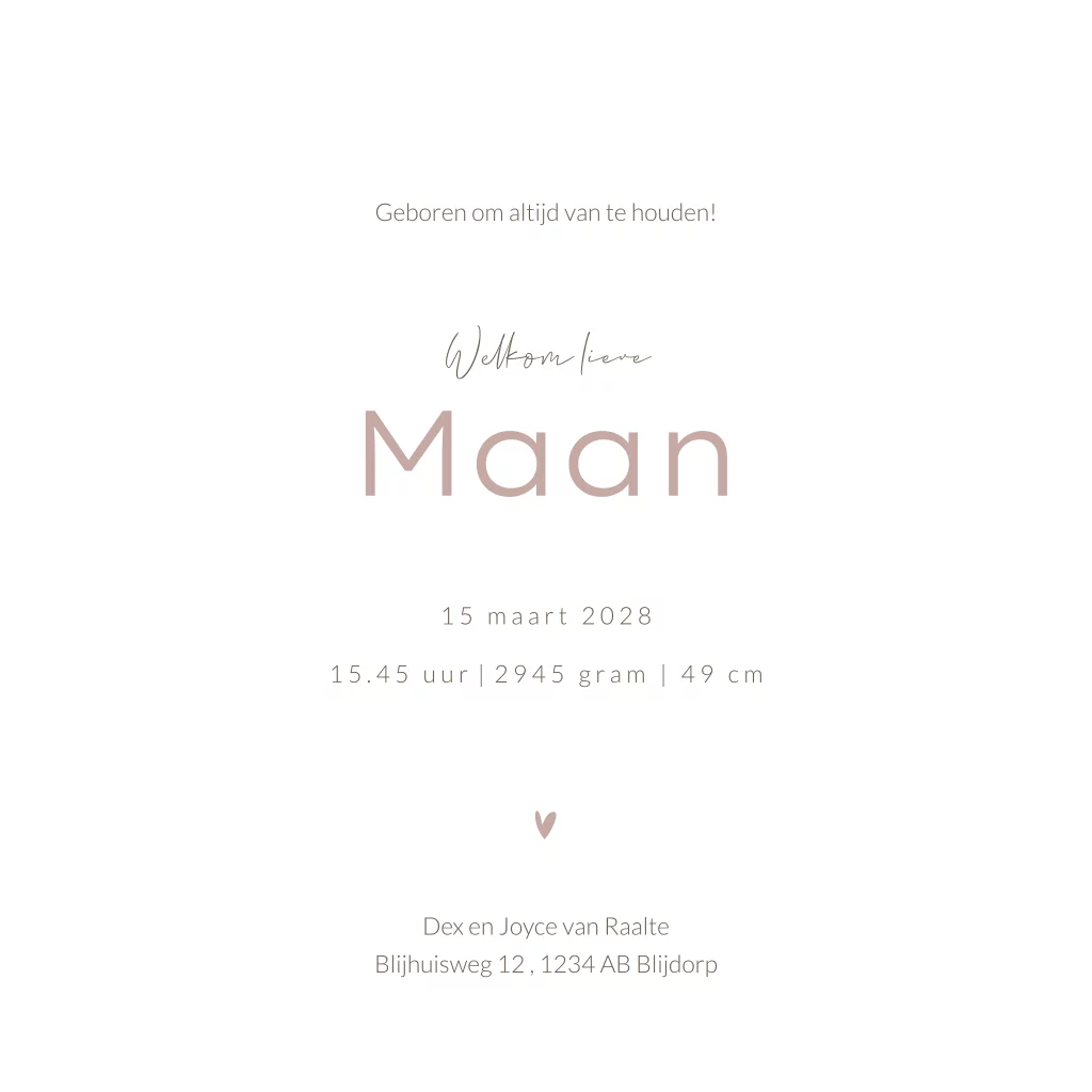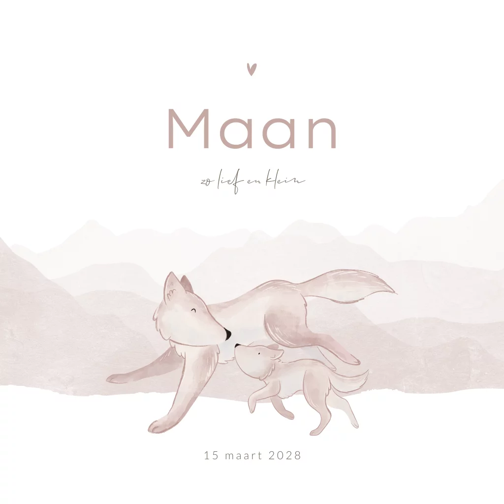 Geboortekaartje voor een meisje met een lief design van een moeder wolf met haar baby. Op de achtergrond zie je bergen in aquarel. Pas dit geboortekaartje Maan eenvoudig aan in de editor.