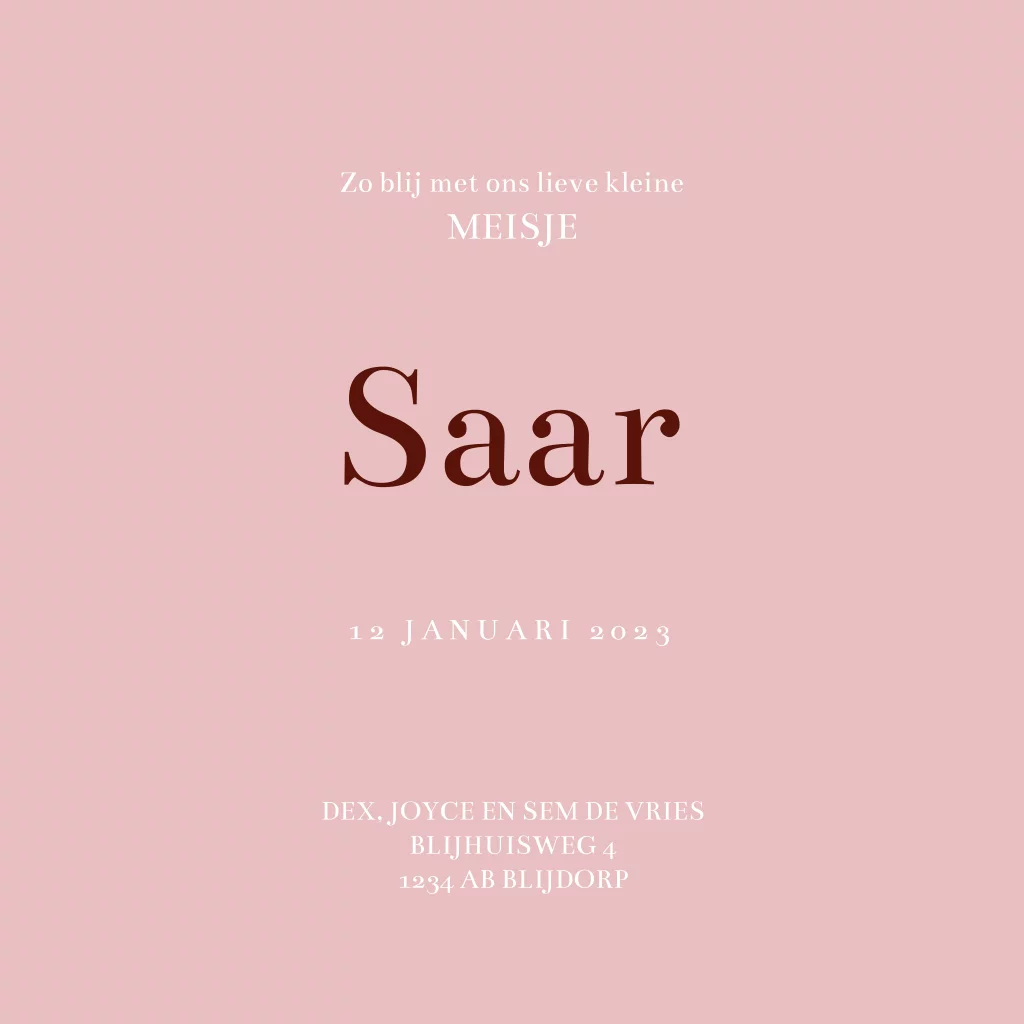 Geboortekaartje voor een meisje met een boom en schattig vogeltje. Aan de boom met gekleurde blaadjes hangen houten bordjes waarop de geboortegegevens staan. Op de voorzijde de babynaam Saar en de geboortedatum. Op de binnenzijde hangen bordjes aan de boom waarop tijdstip, gewicht en lengte vermeld staan. De teksten en kleuren zijn aan te passen in de editor.