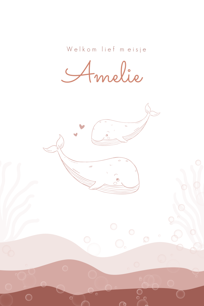 Oceaan geboortekaartje voor een meisje. Op dit kaartje Amelie in onderwaterwereld thema zie je 2 zwemmende walvissen.