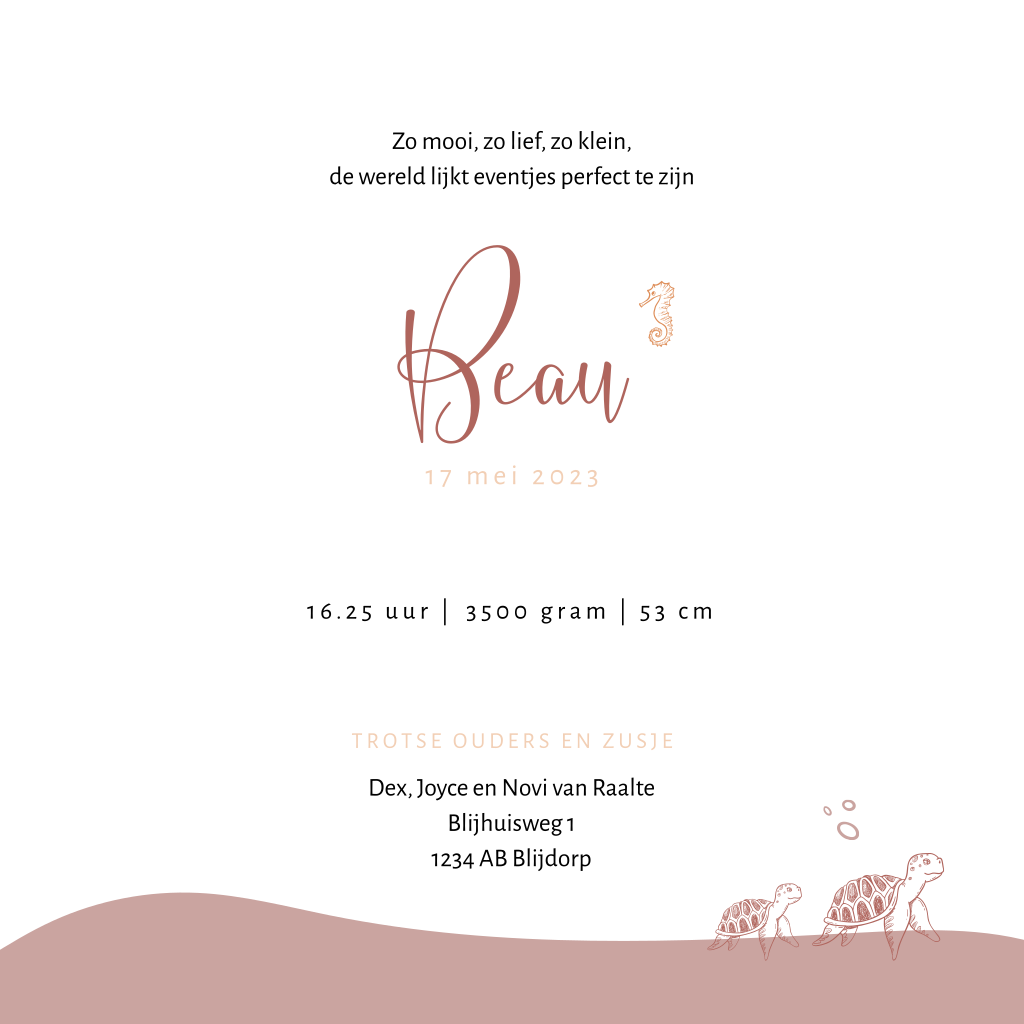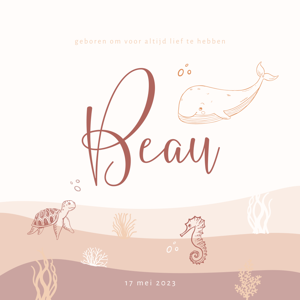 Geboortekaartje Beau voor een zusje in het thema onderwaterwereld. Op dit babykaartje voor een meisje een walvis, zeepaardje en schildpad. Liever andere kleuren, teksten of lettertypes? Dan pas je dit oceaan kaartje voor jullie dochter eenvoudig aan in onze editor.