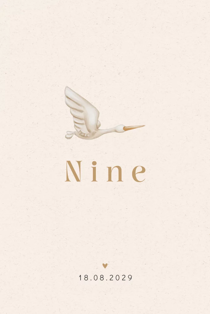 Minimalistisch geboortekaartje voor een meisje. Dit kaartje Nine heeft een basic design in een trendy beige kleur. Boven de naam staat een ooievaar die vliegt en onder de naam is ruimte voor de datum en een regeltje tekst. Dit geboortekaartje heeft ronde hoeken.