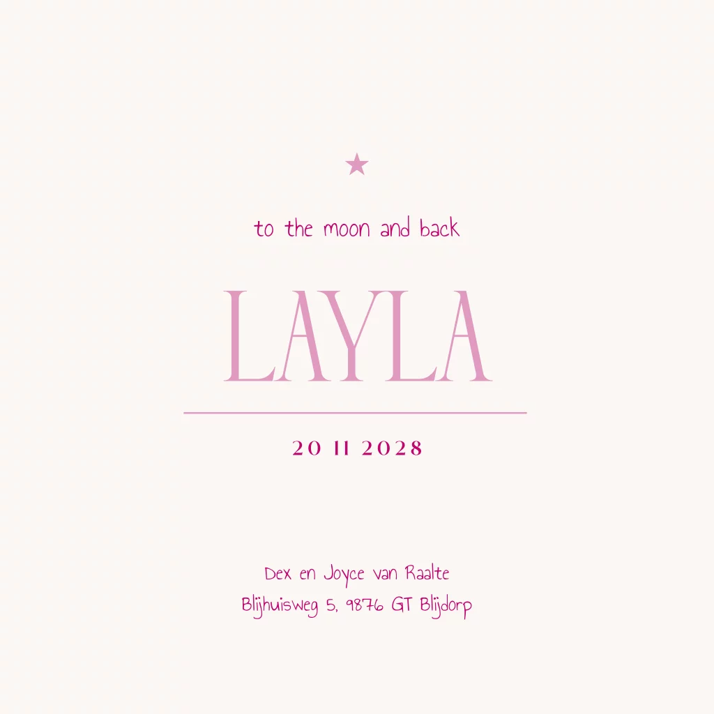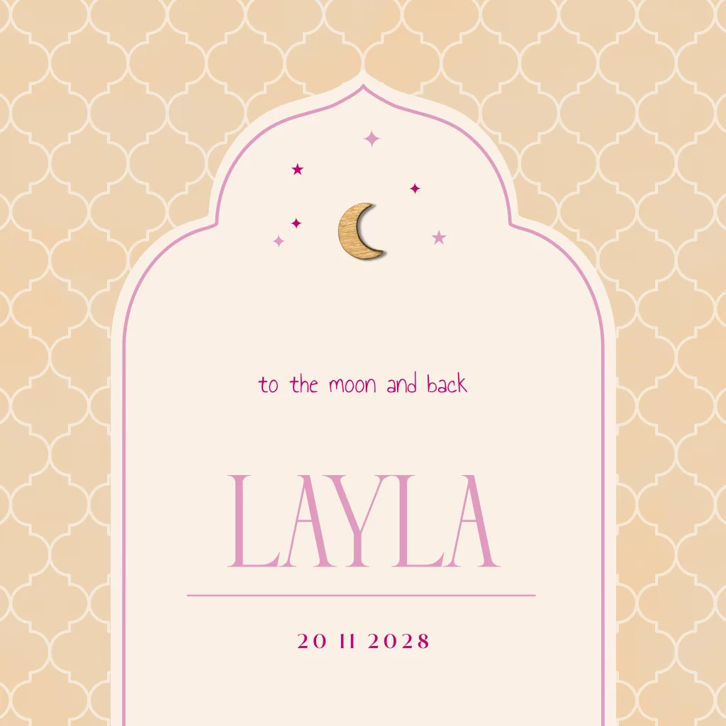 Prachtig geïllustreerd islamitisch geboortekaartje voor een meisje! Op dit Arabische kaartje Layla zie je een gaaf patroontje met een kader rondom de babynaam. In de online editor kun je het kaartje volledig naar eigen wens aanpassen en het compleet maken met een bijpassende envelop voor de geboorte van jullie dochter.