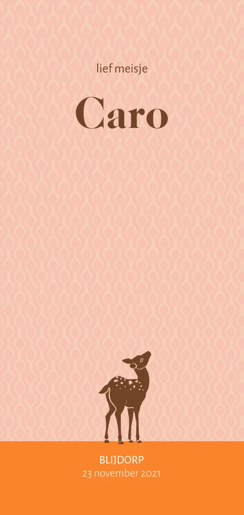 Op zoek naar een retro geboortekaartje? Dan is dit trendy geboortekaartje voor een meisje iets voor jou! De kleuren en het patroon op de achtergrond maken dit kaartje echt retro. Een schattig hertje maakt het kaartje helemaal af.