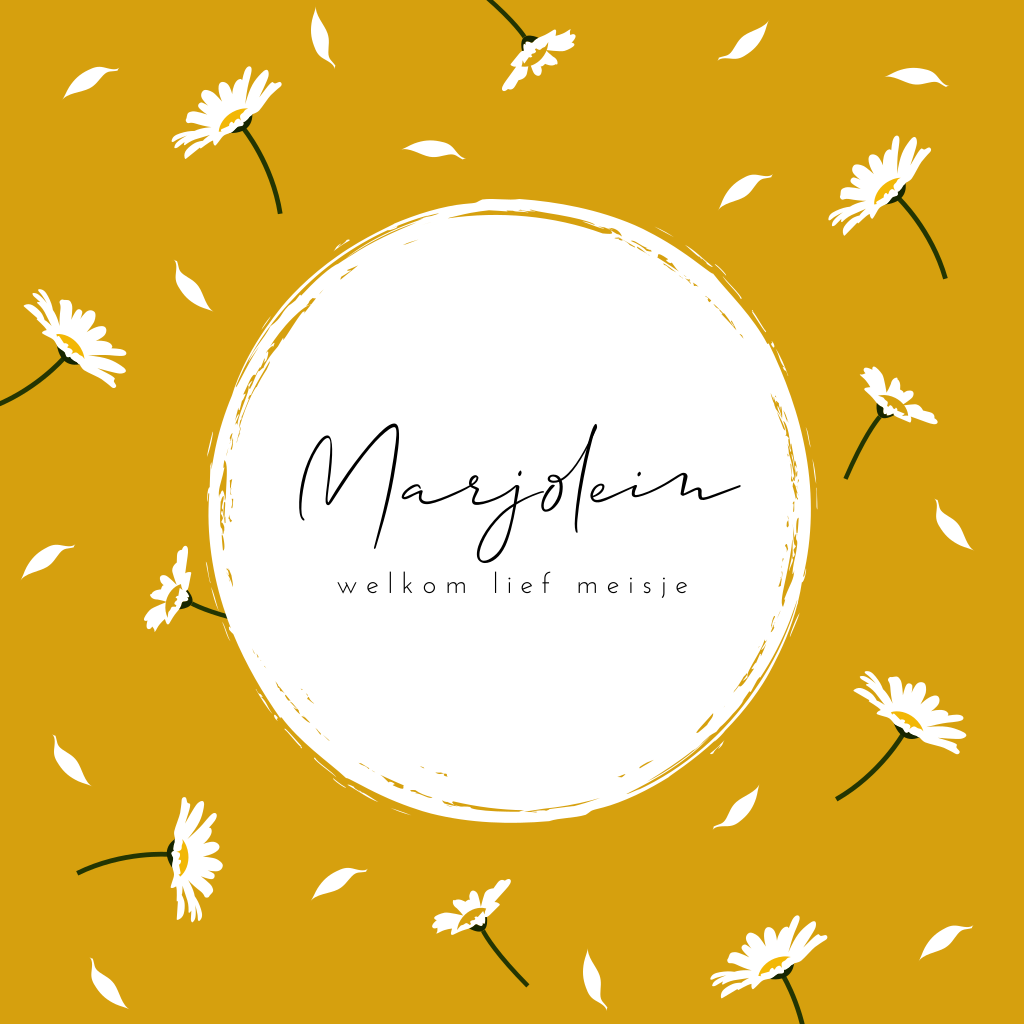 Geboortekaartje voor een meisje met madeliefjes. Op dit babykaartje Marjolein de naam in een witte cirkel, omgeven door dwarrelende blaadjes en bloempjes. De hoeken van dit meisjeskaartje zijn afgerond.
