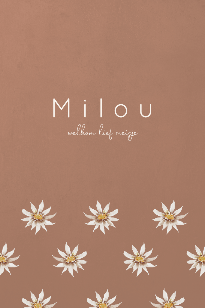 Meisjes geboortekaartje met schattige bloempjes aan de voorkant. Dit babykaartje met de naam Milou heeft een trendy achtergrondkleur, waarop de witte bloempjes erg mooi naar voren komen. Teksten en kleuren zijn naar eigen smaak aan te passen in onze editor. Hulp nodig? Wij helpen je graag verder.